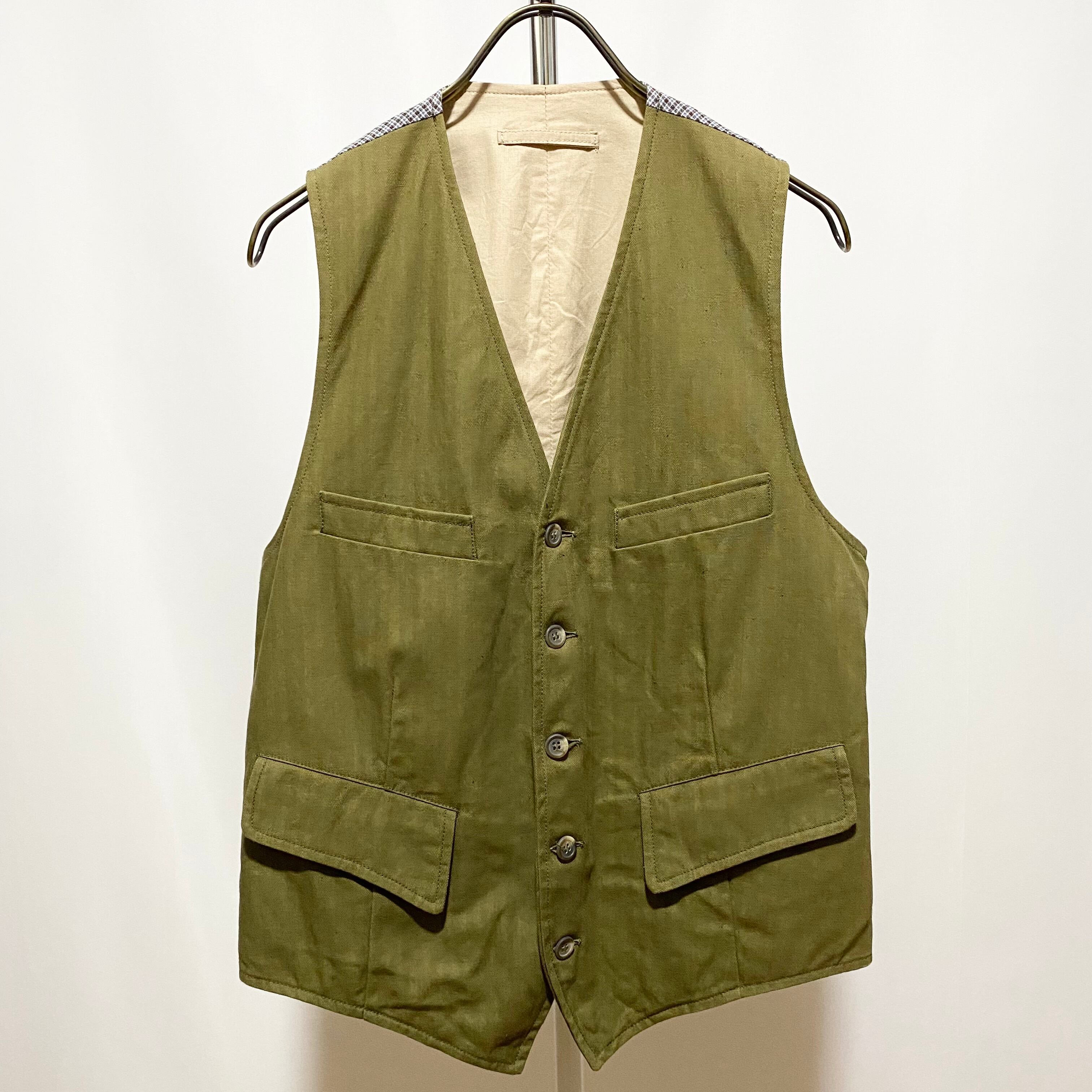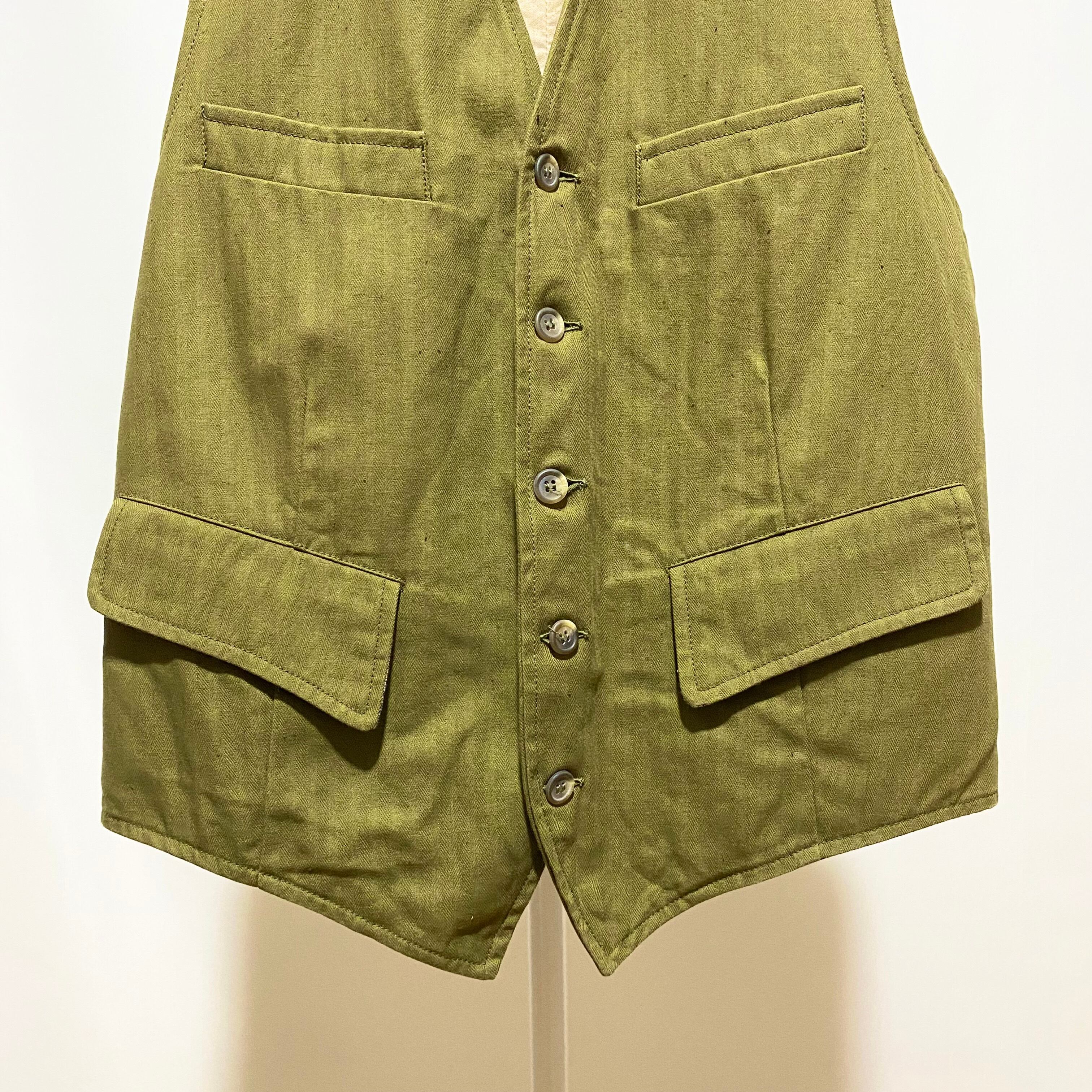 ヴィンテージのヘリンボーン生地はまだ水入れ程度。ディテールを吟味しつつも無駄を省いたベストはとても贅沢な逸品◎◎◎ 何しろプロパーで約4万円ですから、高級ベストです 笑