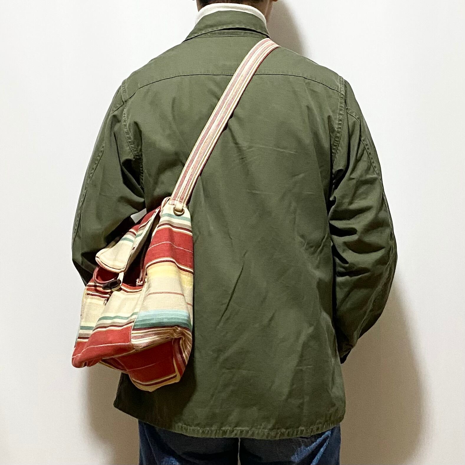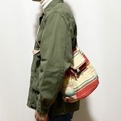 ネイティブアメリカンへの愛を込めたボーダーファブリックを使ったこのバッグ。同じ生地を使ったメッセンジャータイプはかなり高値になっていますが、球数的にもこっちが少ない感じがします。当時見なかったし。