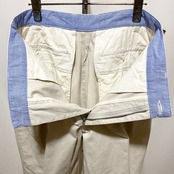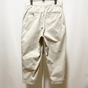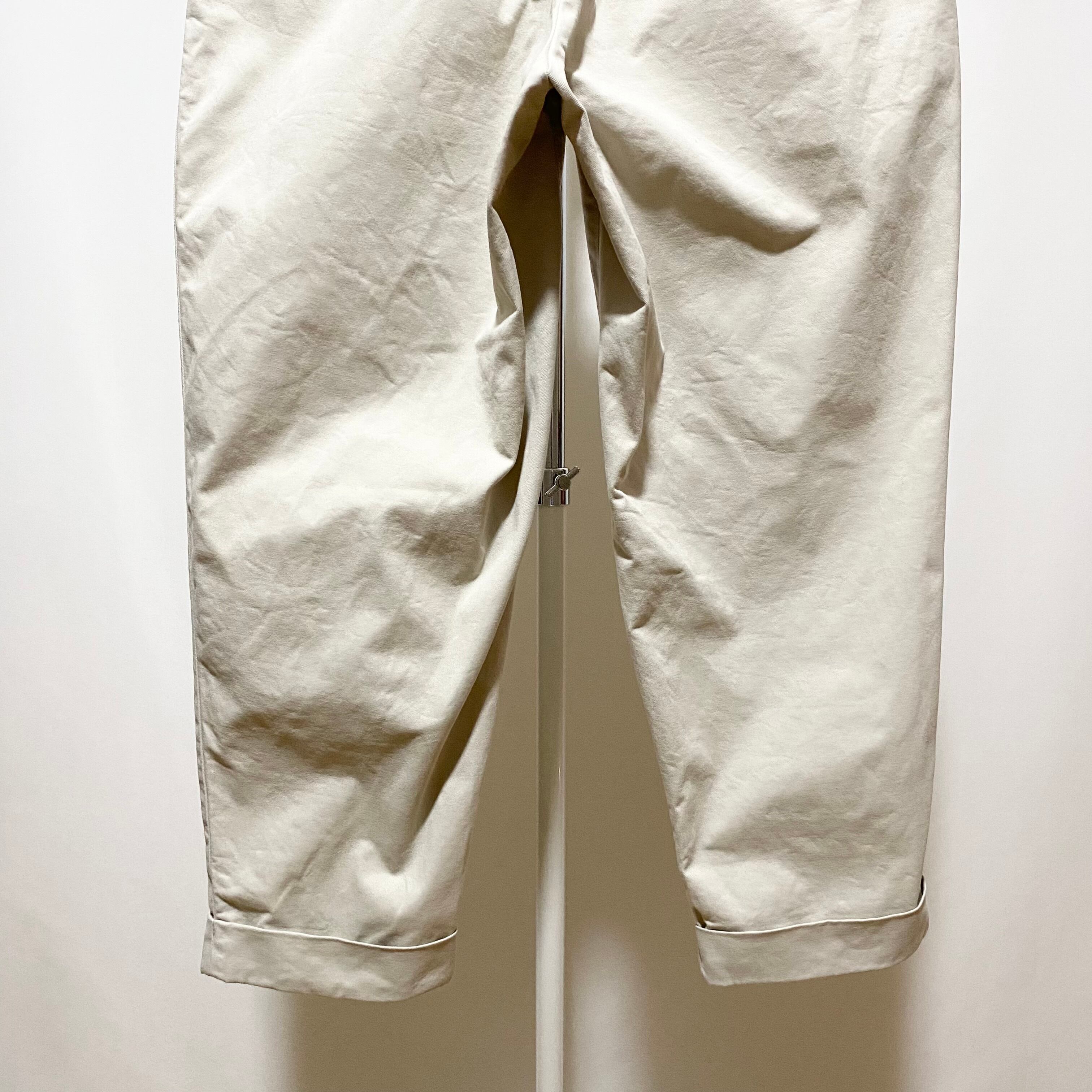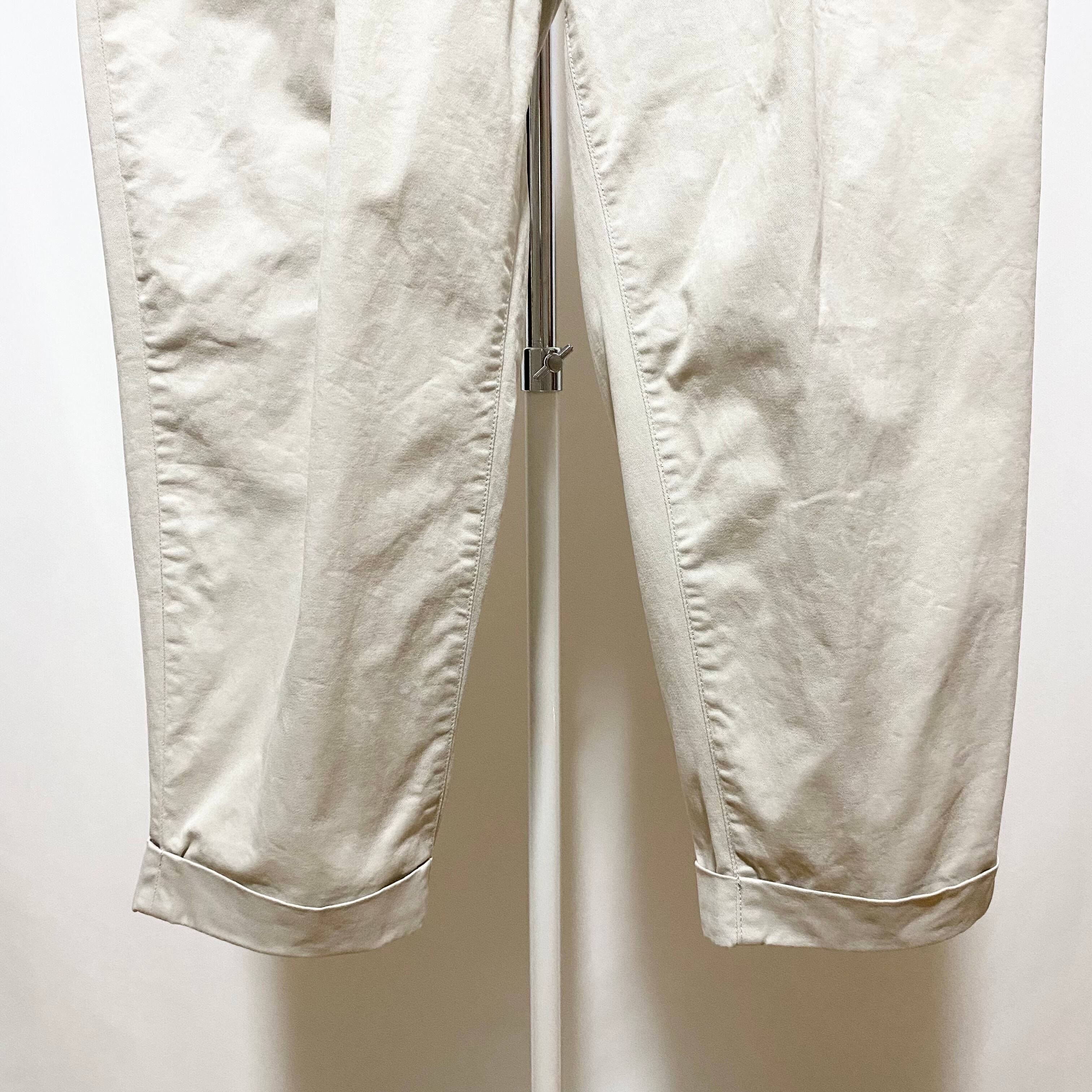 同レーベルの定番チノの1つ。しっかり入ったプリーツ(タック)に深めの股上と太めの渡幅、そこにギュンとテーパードさせてダブルの裾で短丈という一見すると癖強なボトムス。