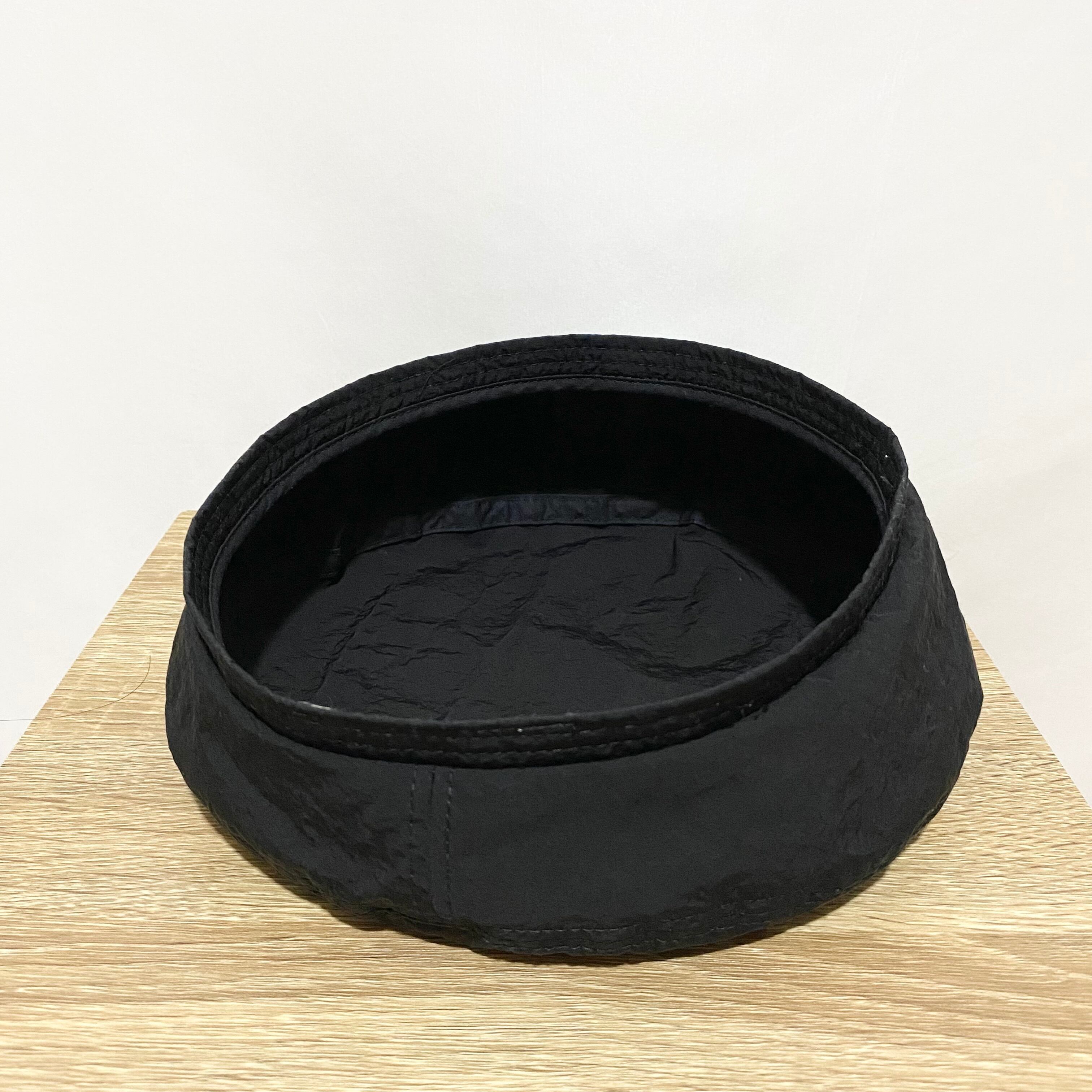 同ブランドでは定番の左右非対称なタイプのベレー。シンプルで使いやすいブラックの生地はシワ感がありパリパリした質感のナイロン。被ってから様々な形に仕上げやすいです◎◎◎
