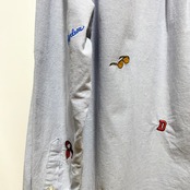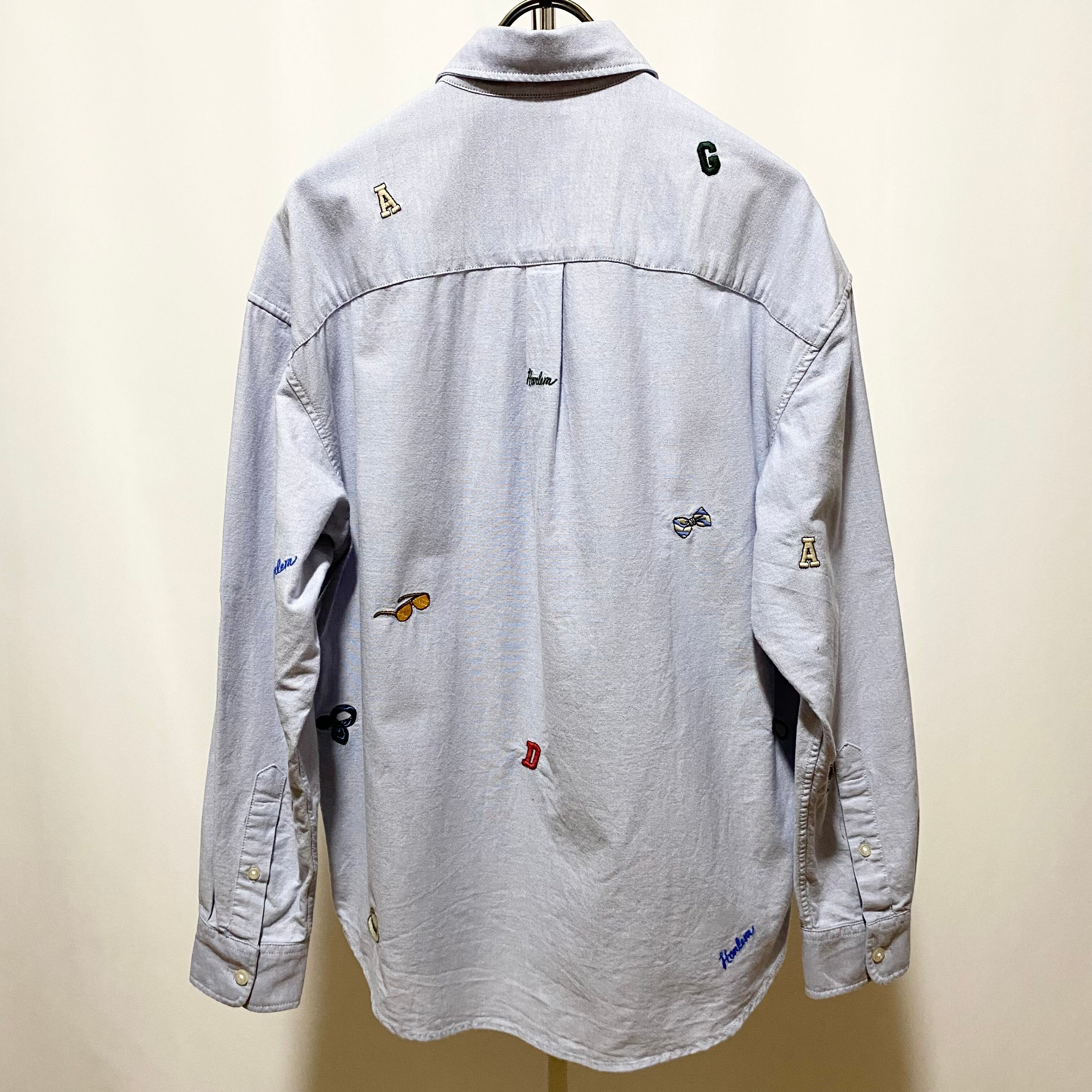 今回のこのシャツは少しムラ感のあるオックスフォード生地で小襟のセミワイドカラー。そこにトラッドブランドよろしくな配置で贅沢に沢山の刺繍が施されております。