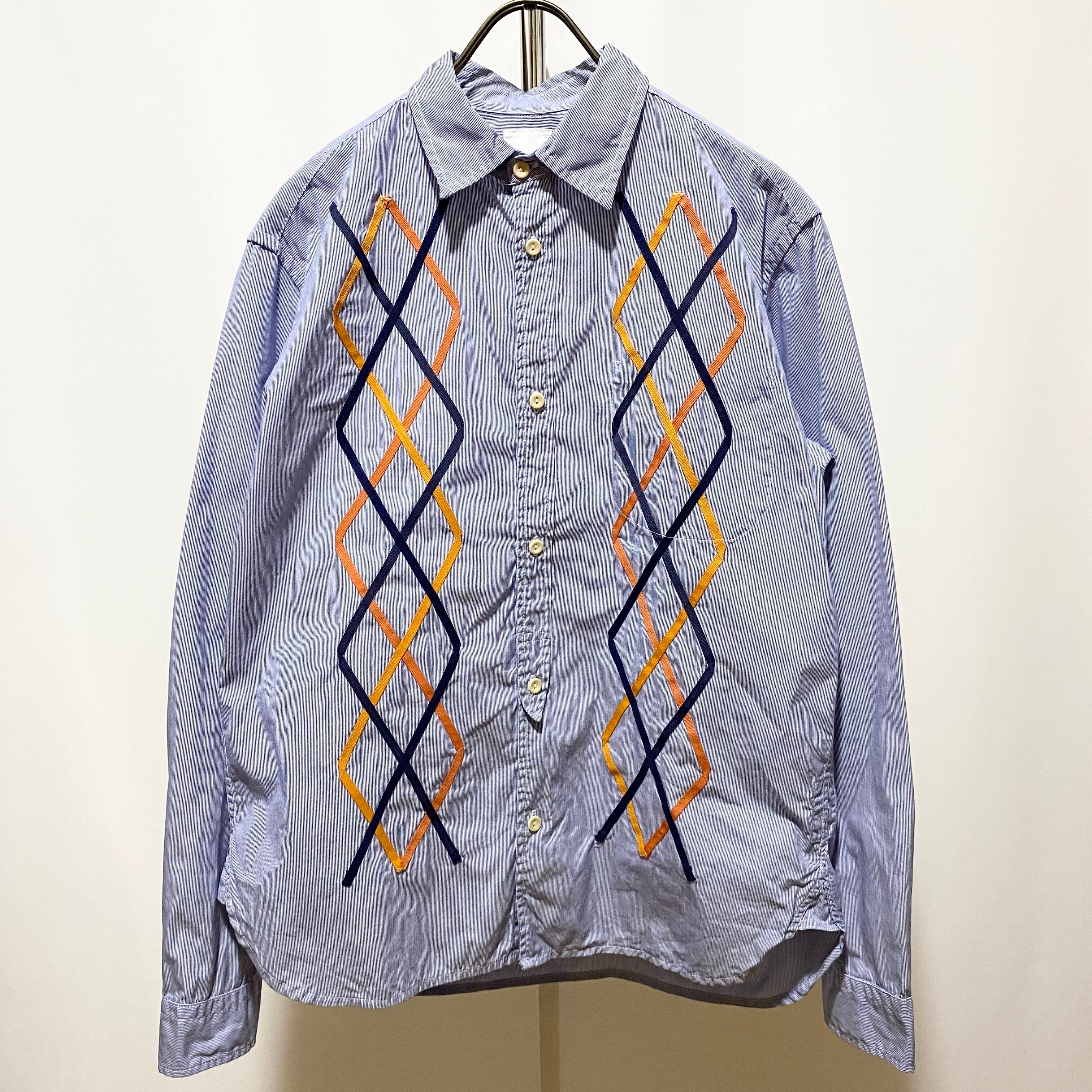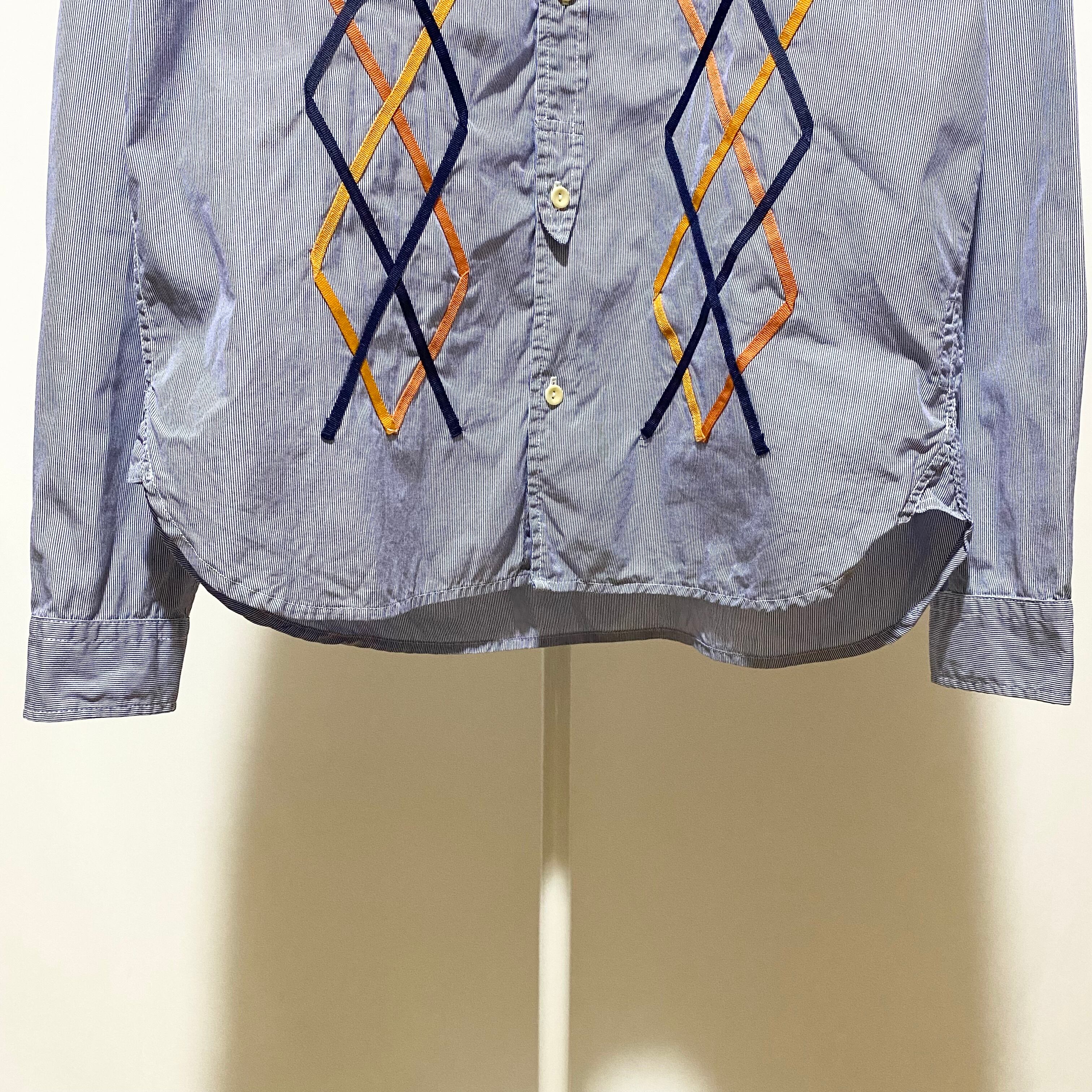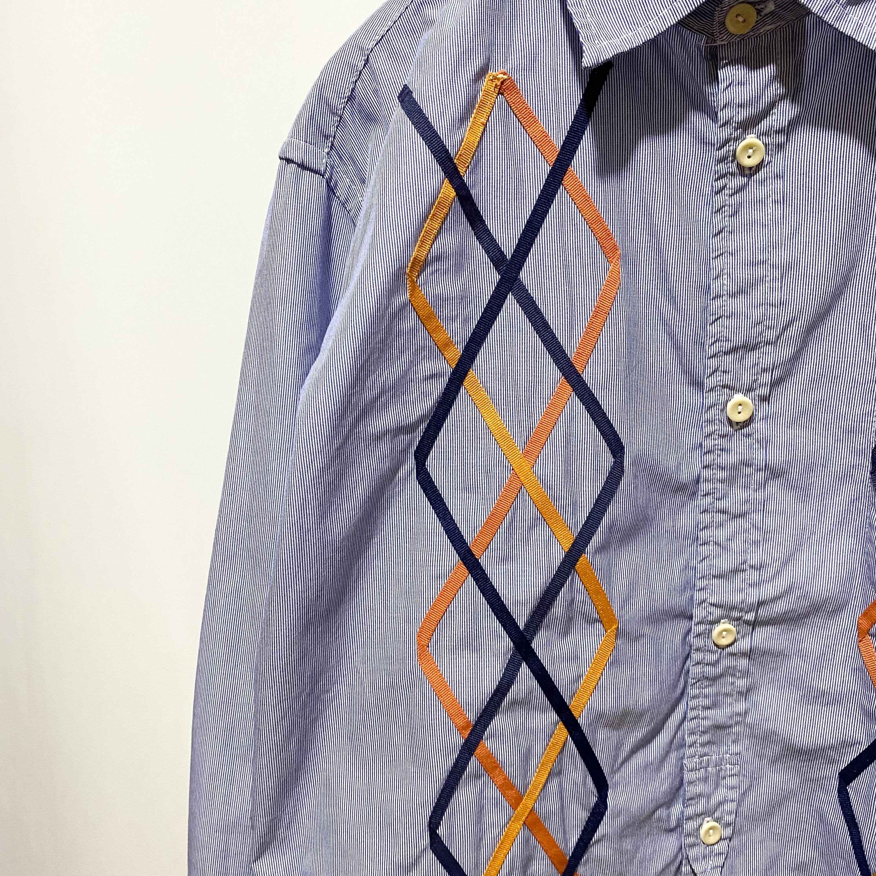 細いピッチのストライプ生地で仕立てたシャツの前身に、テープでアーガイルをデザインして縫い付けた手の込んだ1着(そもそもこのブランドで手が込んで無い物は少ない)