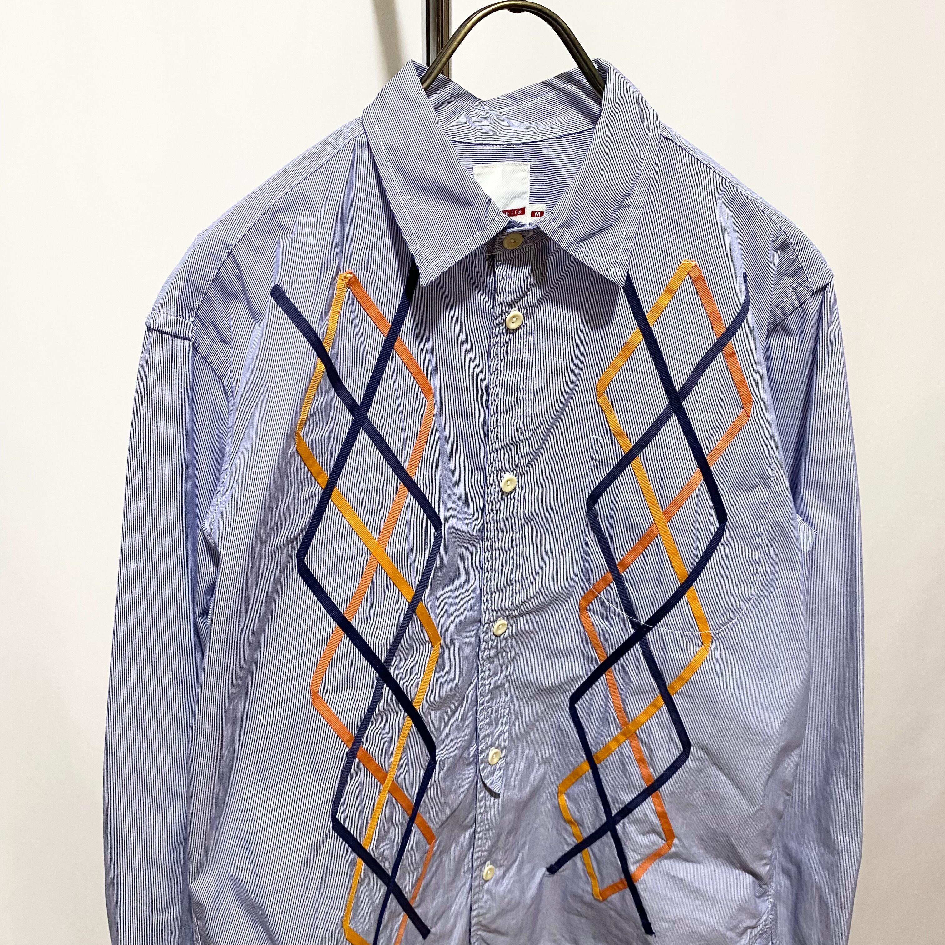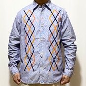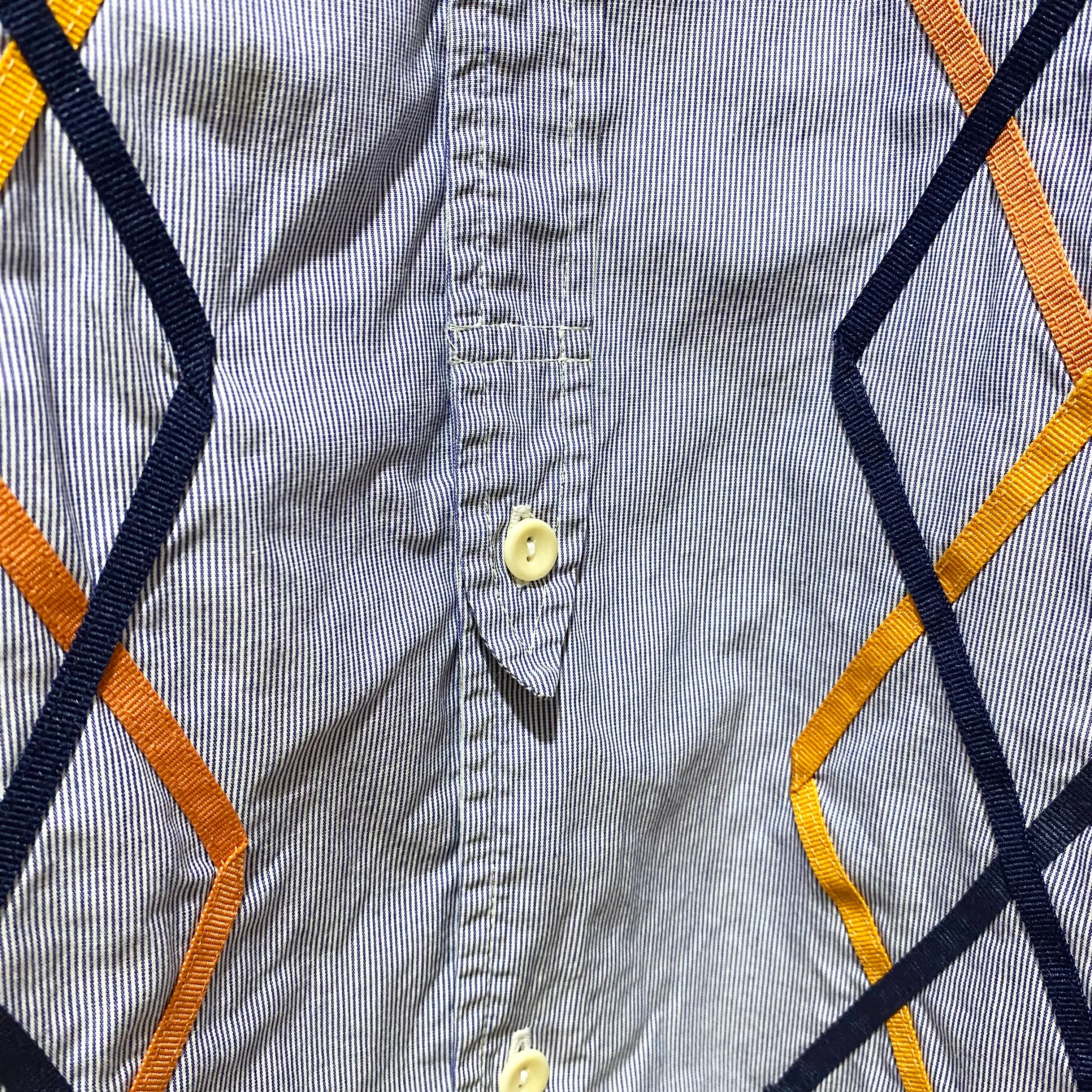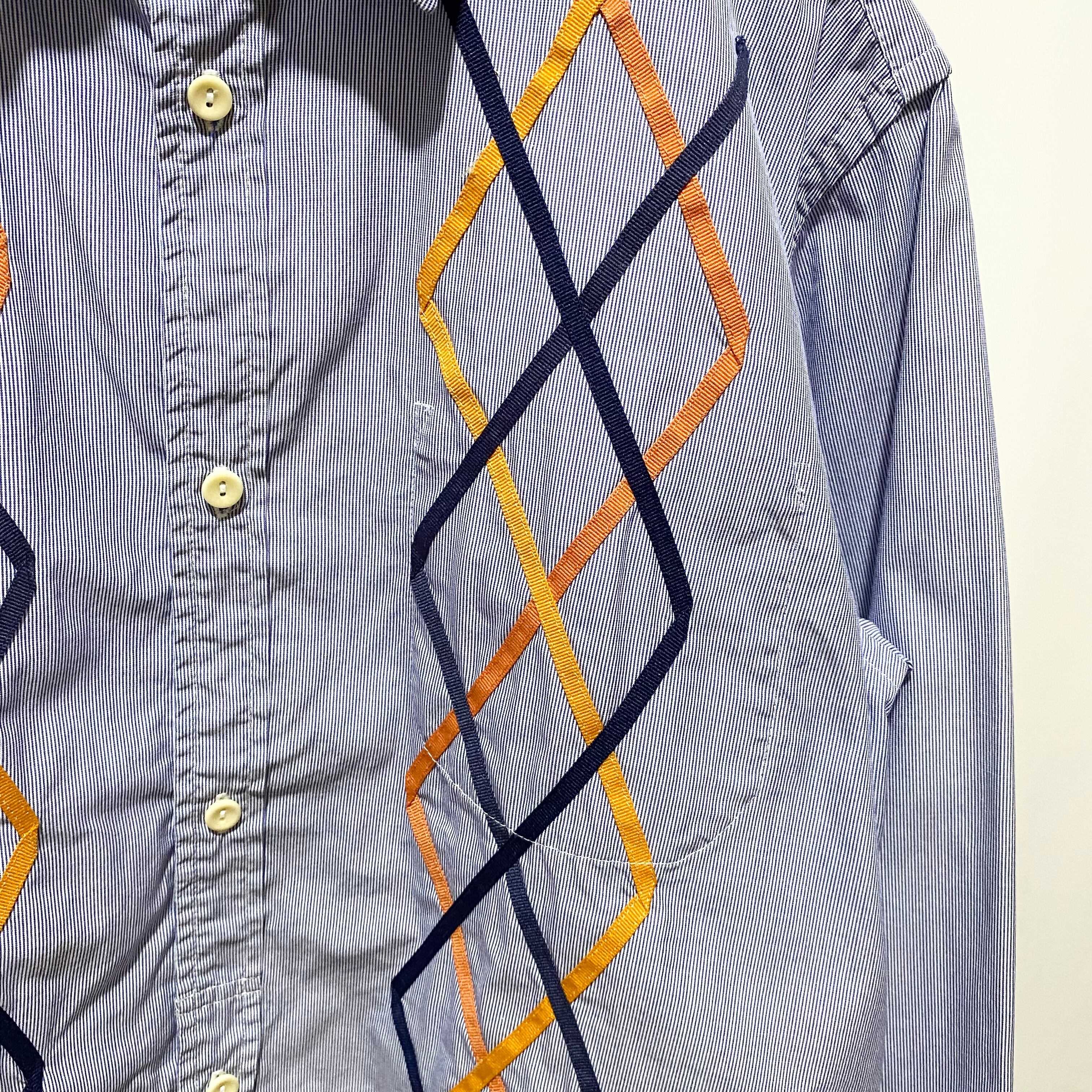 細いピッチのストライプ生地で仕立てたシャツの前身に、テープでアーガイルをデザインして縫い付けた手の込んだ1着(そもそもこのブランドで手が込んで無い物は少ない)