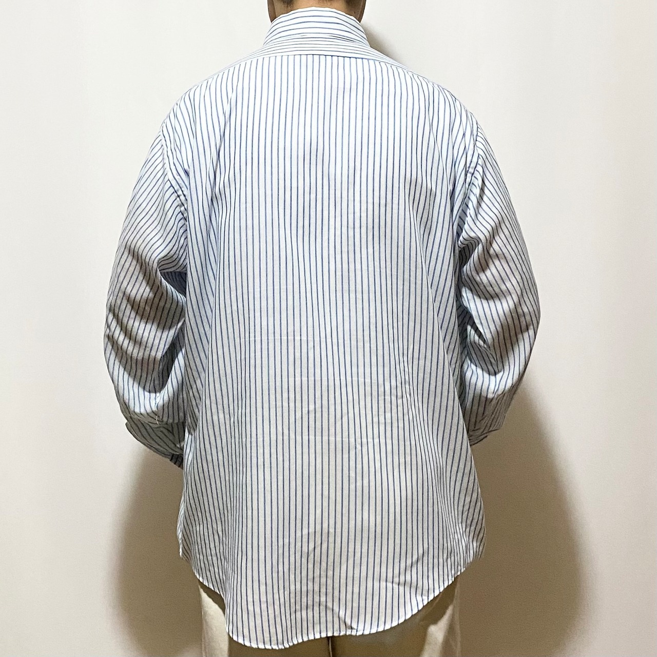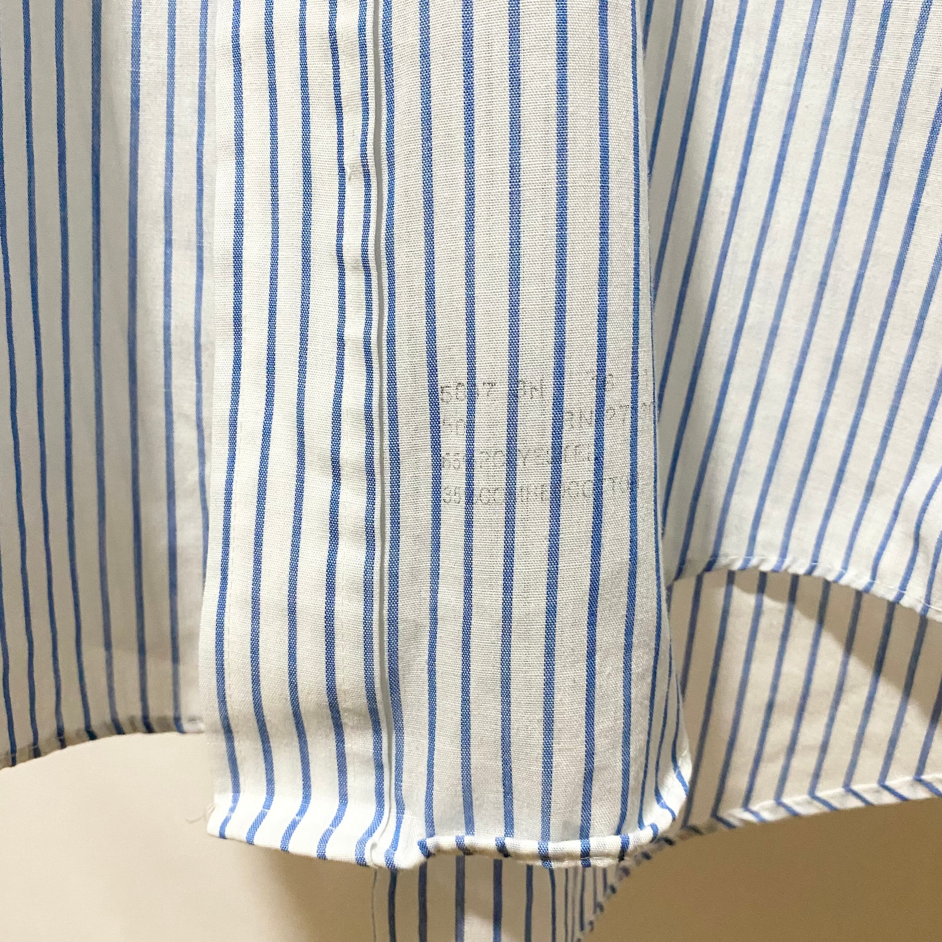 テロテロの綿ポリ生地に爽やかなストライプ。ロングポイントの襟型のボタンダウンは全然トラッドでは無いけど、この生地感でこの配色なら白いTシャツに羽織るぐらいで丁度イイ◎◎◎