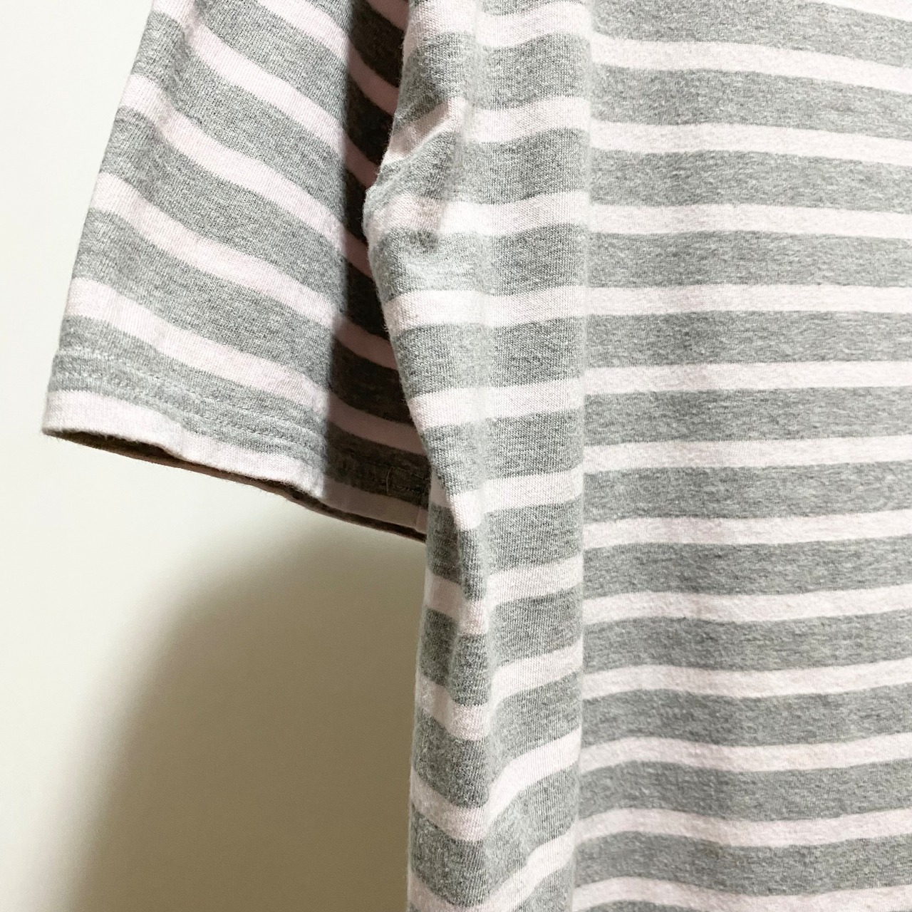 薄っすらな淡いピンクに明るめのグレーの配色はコントラストも弱いので無地の感覚でスタイリングできるアイテム。真夏でも厚くないこの生地は店主も愛用の1品でもあります◎◎◎