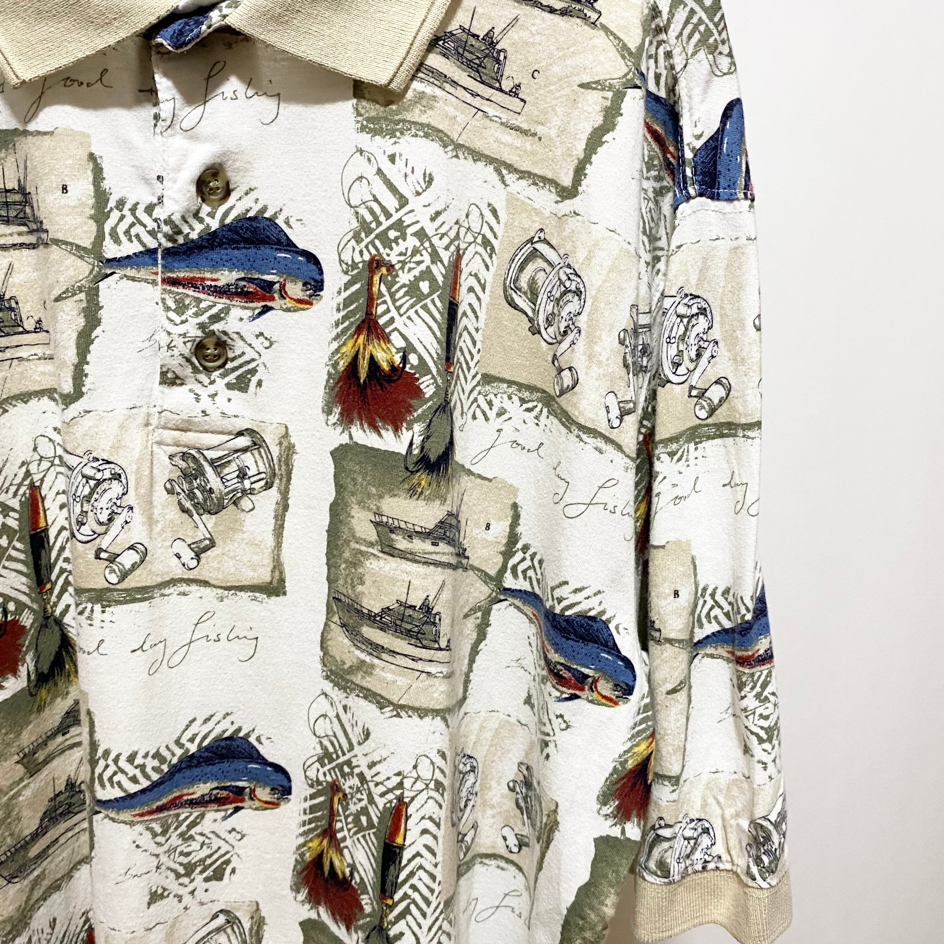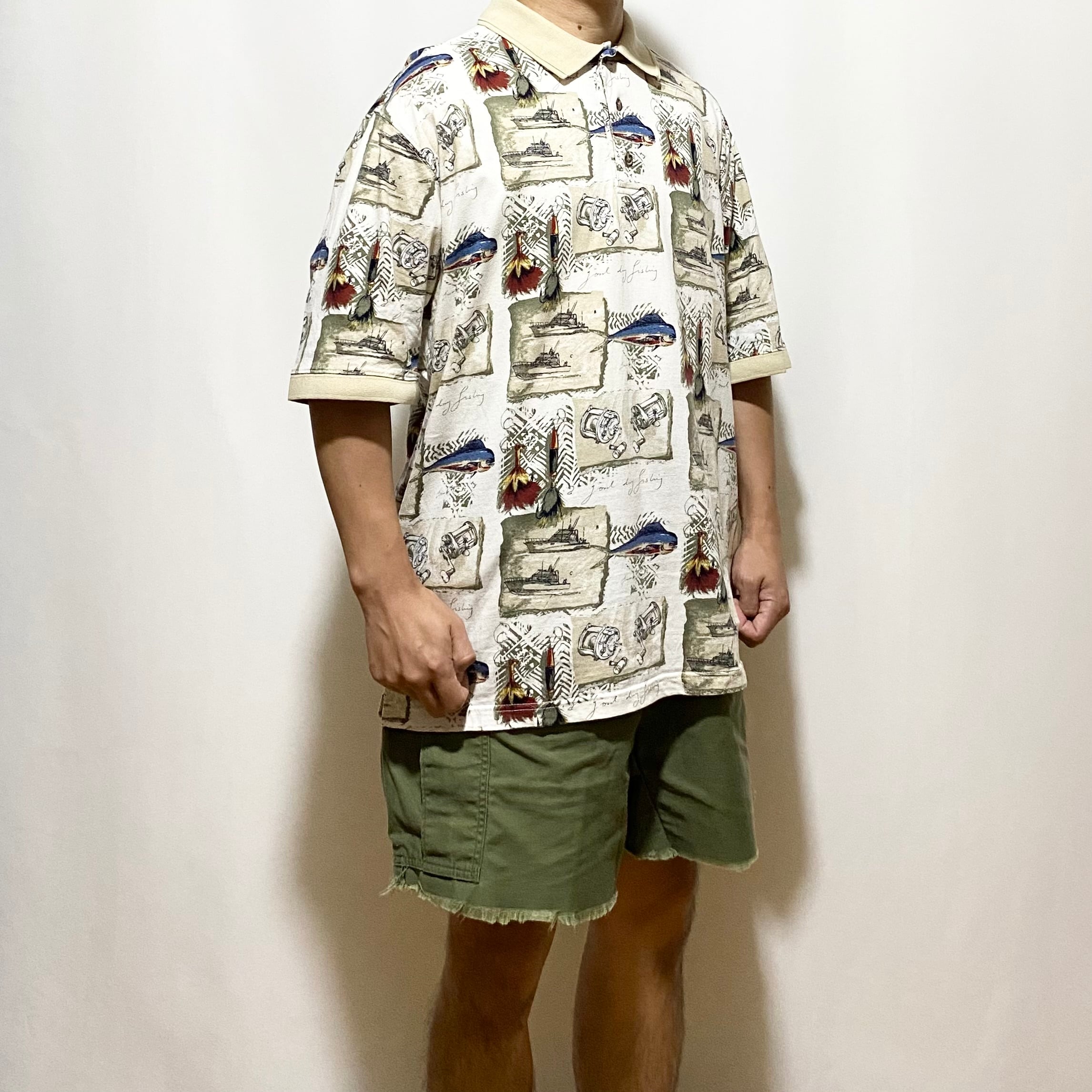カットソー生地の全面にプリントされたフライフィッシングにまつわる事柄をプリントしたこのポロシャツ◎◎◎ 90年代的ビッグなシルエットで土臭いながらも品の良さを感じる仕上がり◎◎◎