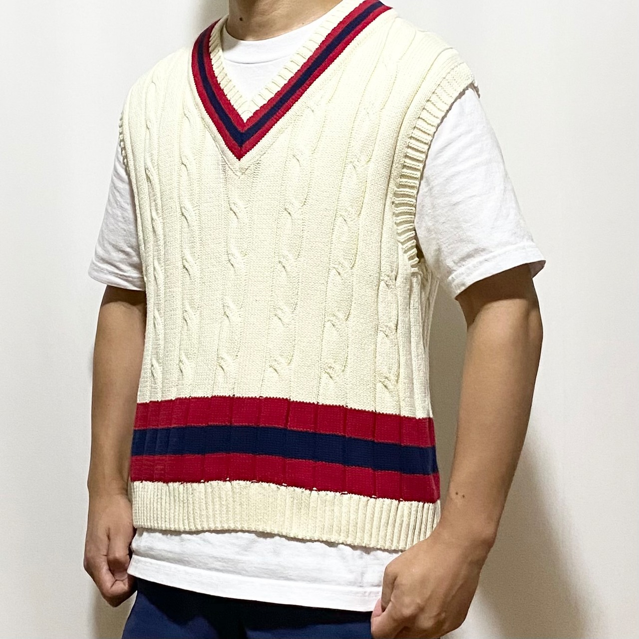 今回は少しゆったりとしたベスト。Tシャツに着ると、ん?丁度いい肩の落ち具合にこの感じは90年代のヒップホップを感じる雰囲気じゃないですか◎◎◎
