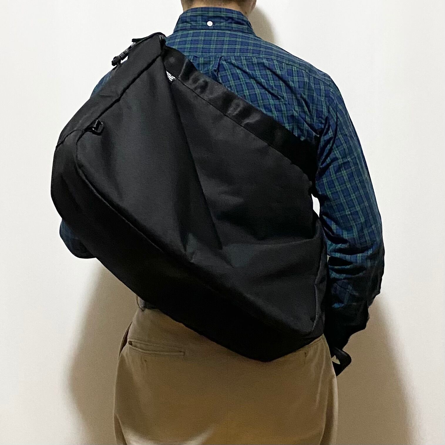 斜め掛けにしては程良く大容量でバックパック並みの収納力。ボディーはドビー織のポリエステルで底面は補強と耐久性を兼ねてバリスティックナイロン。しっかり裏地が付き細やかなコンパートメントも整った内側に、自転車乗りが嬉しいストラップの仕様◎◎◎