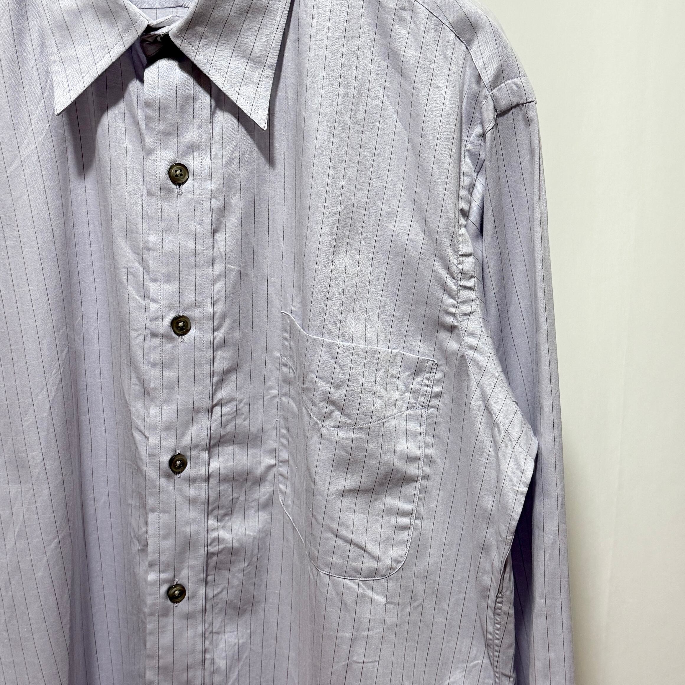 淡いパープルの生地で縦ラインが強いストライプ味を感じるチェック。近くで見ると織柄が美しくとても上品な仕上がりのドレスシャツになっております◎◎◎