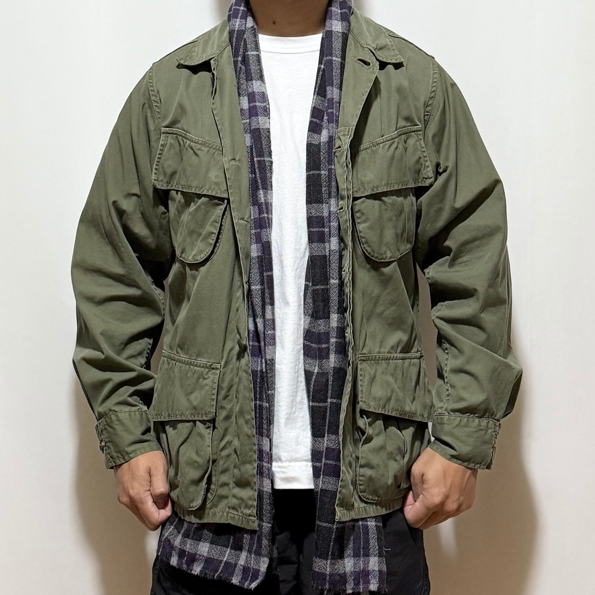 ストールと聞くとついつい綺麗なスタイリングをイメージしてしまいますが、Tシャツやスウェット、パーカーに臆せず合わせるのもファッションの面白さかと◎◎◎ どことなくグランジなネルシャツの様な表情に見えるのも面白いですね。
