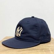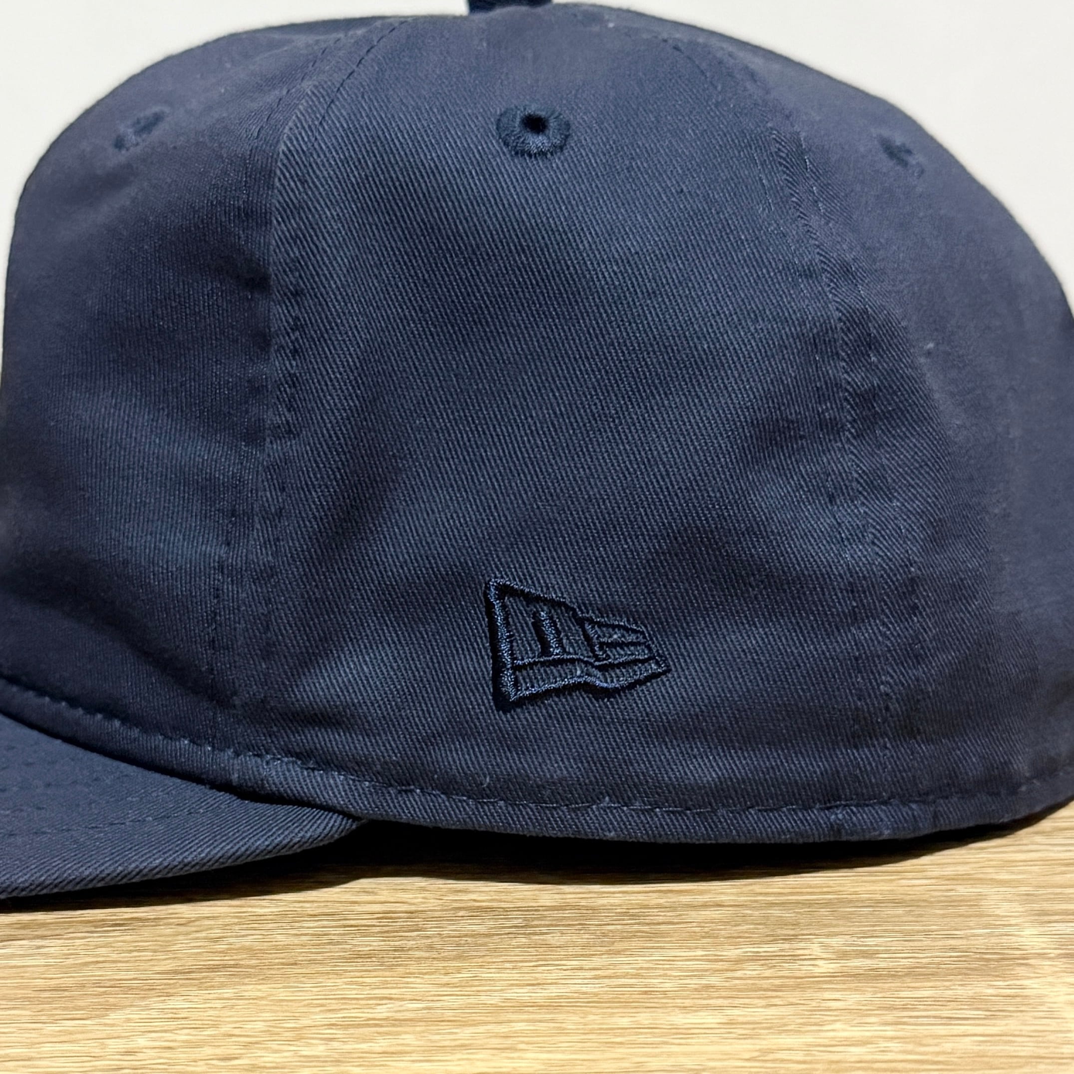 ボディはコットンファブリックでくすんだ枯れた感じのネイビー。旧字体のヤンキースロゴはベージュ。アンコ抜きバッターマンもベージュで日焼け感を演出◎◎◎ NEロゴも同色刺繍で最高◎◎◎