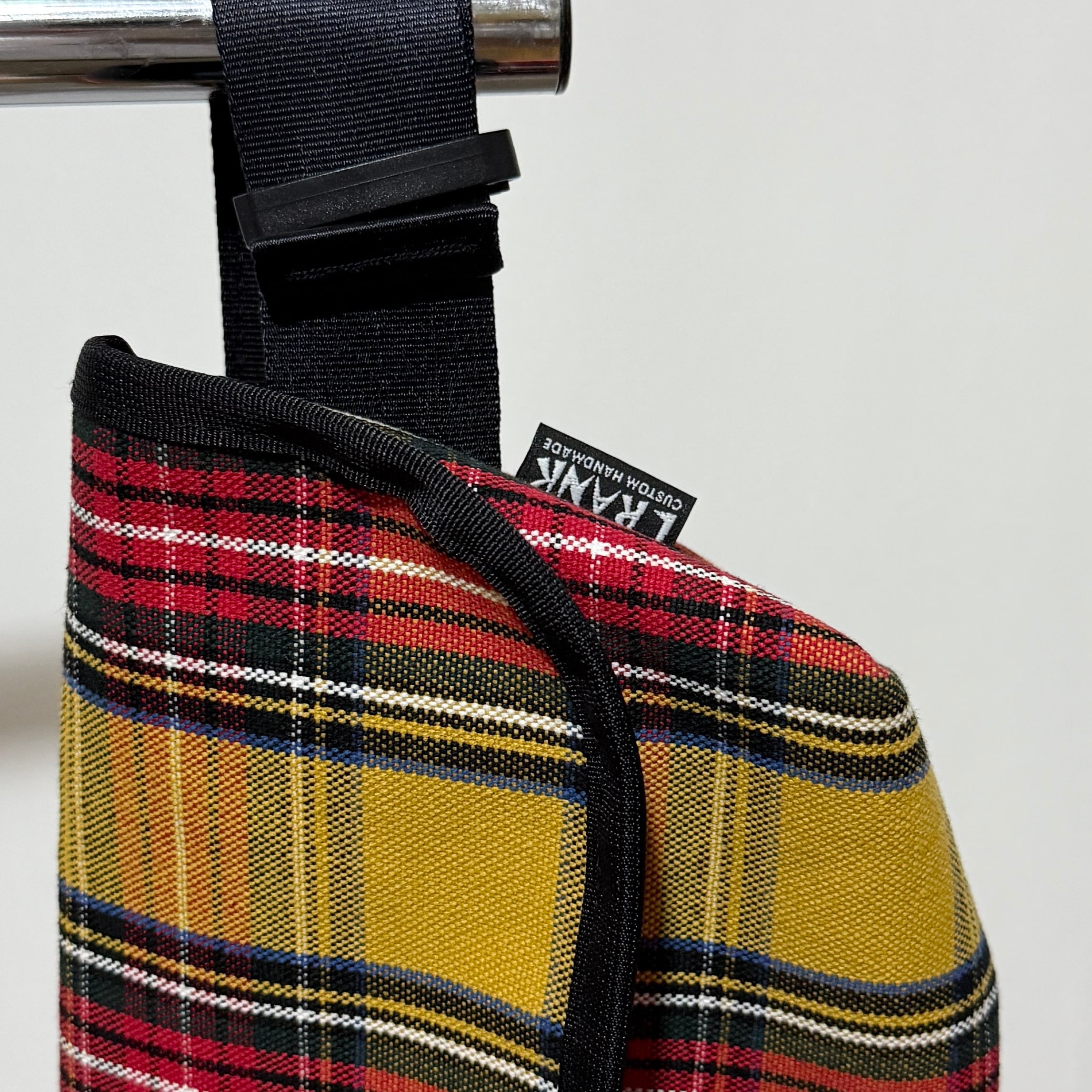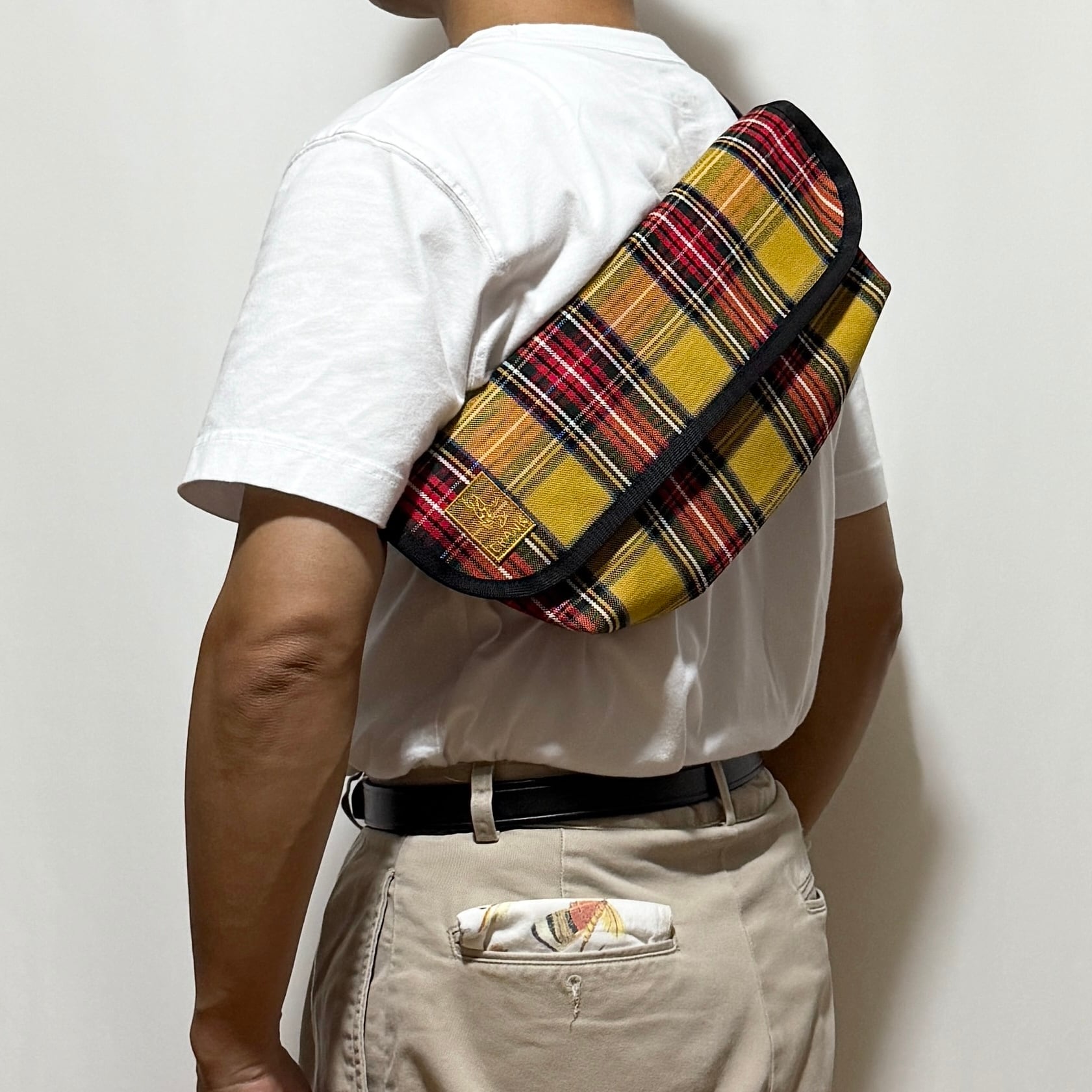 スモールサイズで、ウエストバッグ的な容量で、ストラップはメッセンジャー仕様の本格派◎◎◎ ターポリンの裏地でタフなガシガシ使えるマテリアルで挑発的なパンクなチェック◎◎◎