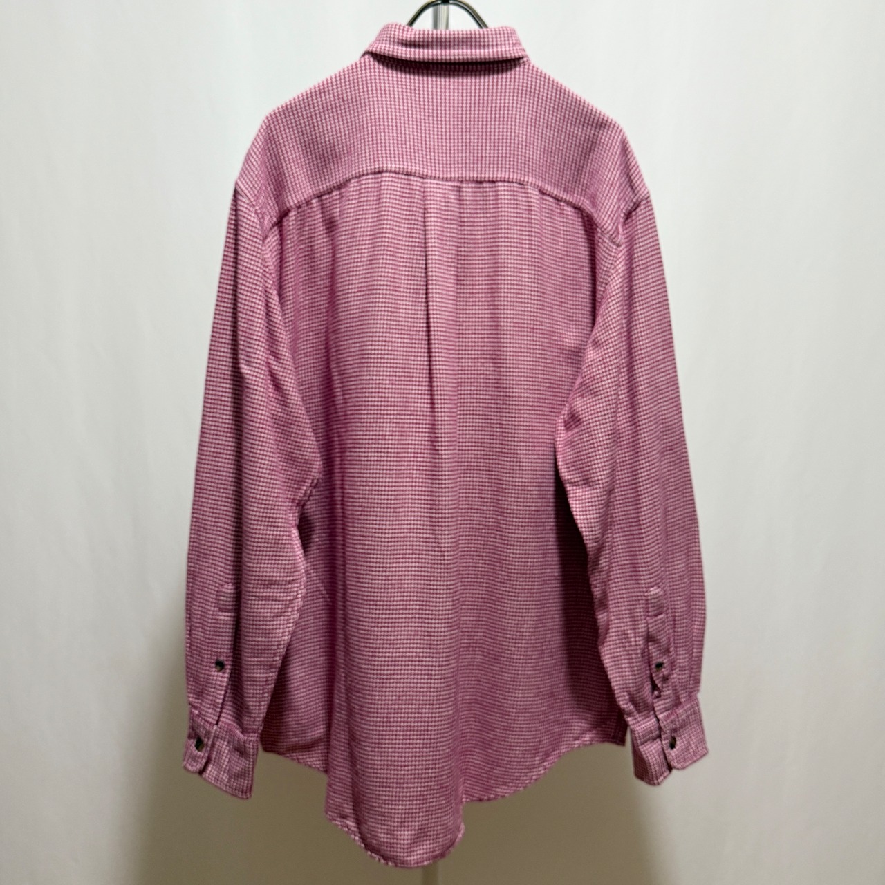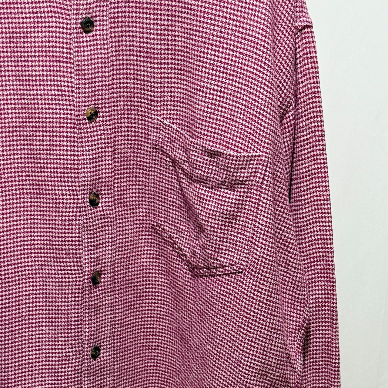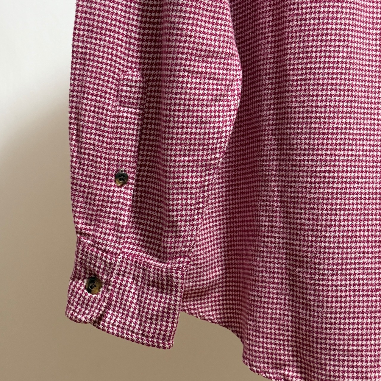 インパクトのある強いピンクのハウンドトゥース生地を90年代らしい大きいサイズ感で仕上げたこちら。エディーバウアーのように少しぺたんとした襟型に茶色のボタンで基本は土臭く。野暮ったくなりそうなピンクを絶妙なバランスで仕上げております。