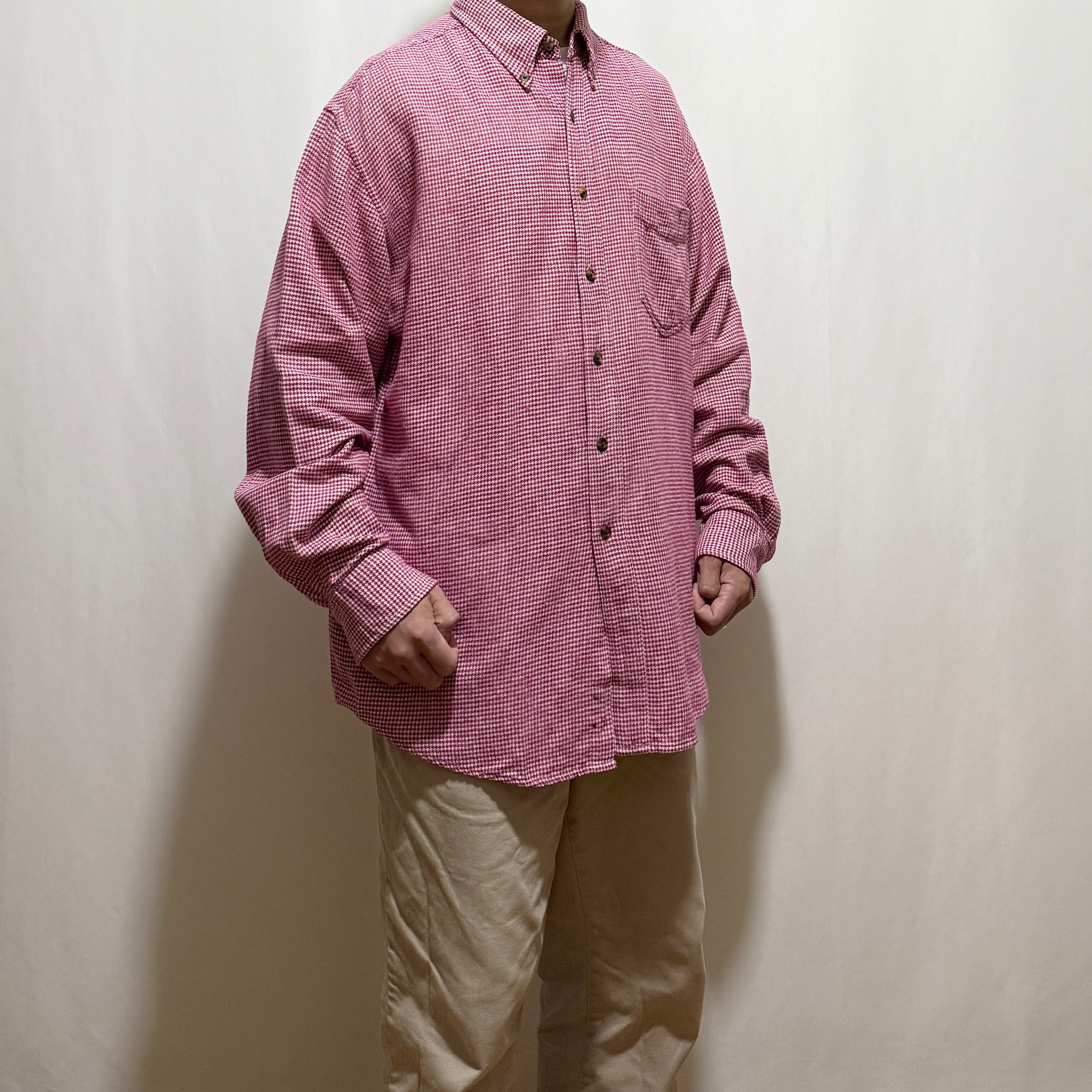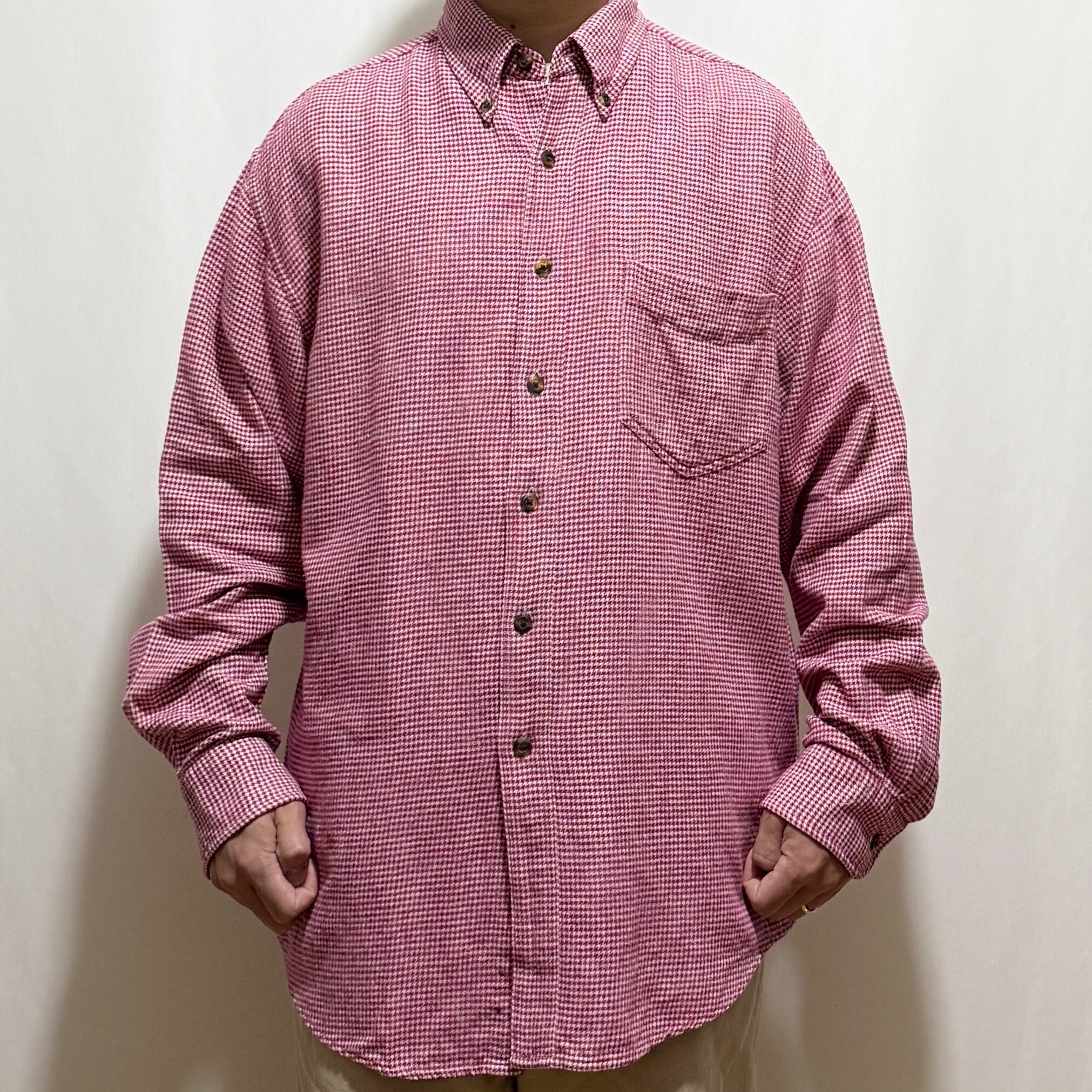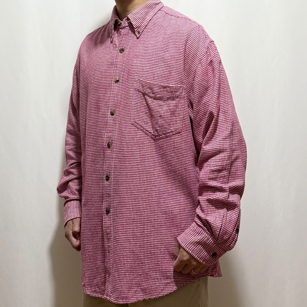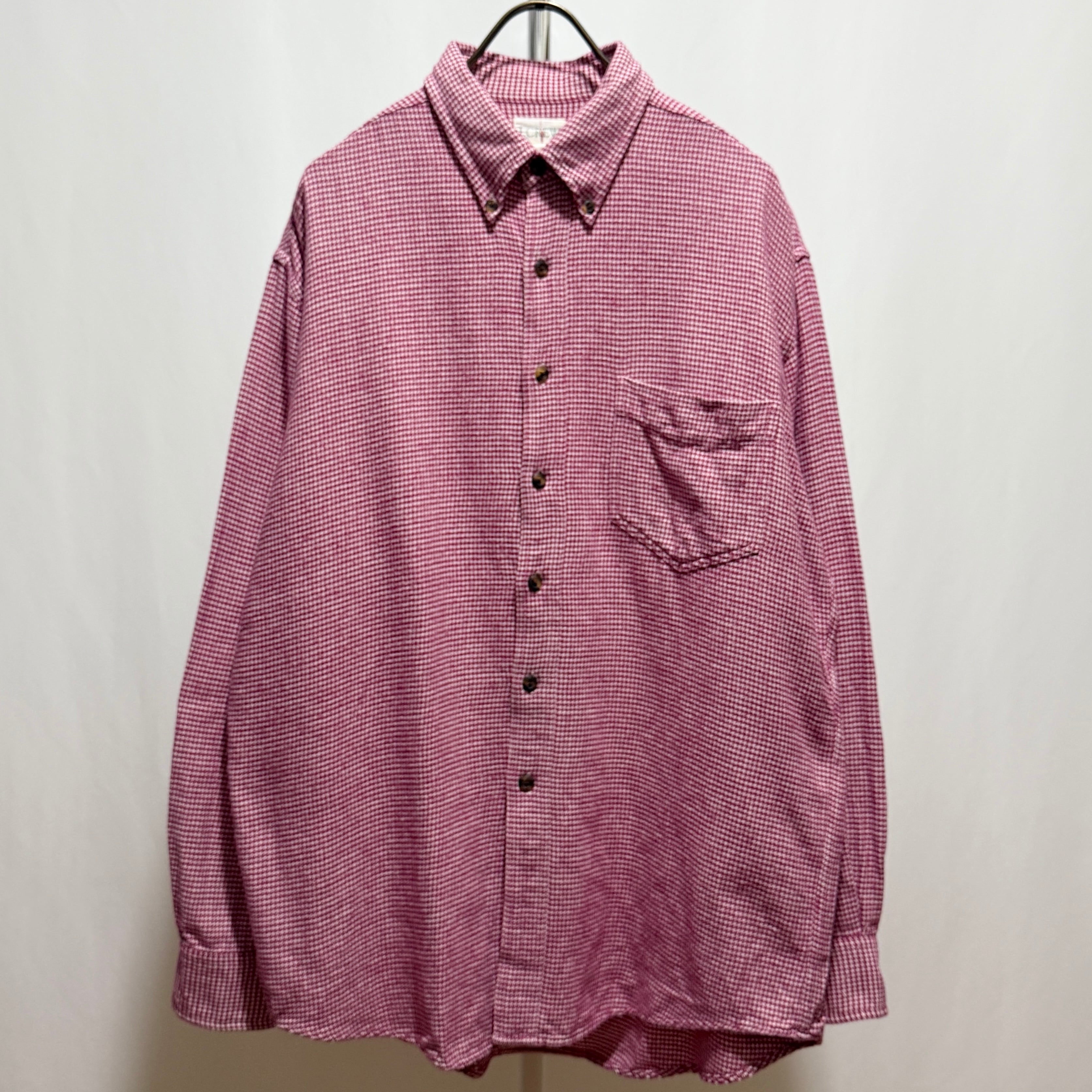 インパクトのある強いピンクのハウンドトゥース生地を90年代らしい大きいサイズ感で仕上げたこちら。エディーバウアーのように少しぺたんとした襟型に茶色のボタンで基本は土臭く。野暮ったくなりそうなピンクを絶妙なバランスで仕上げております。