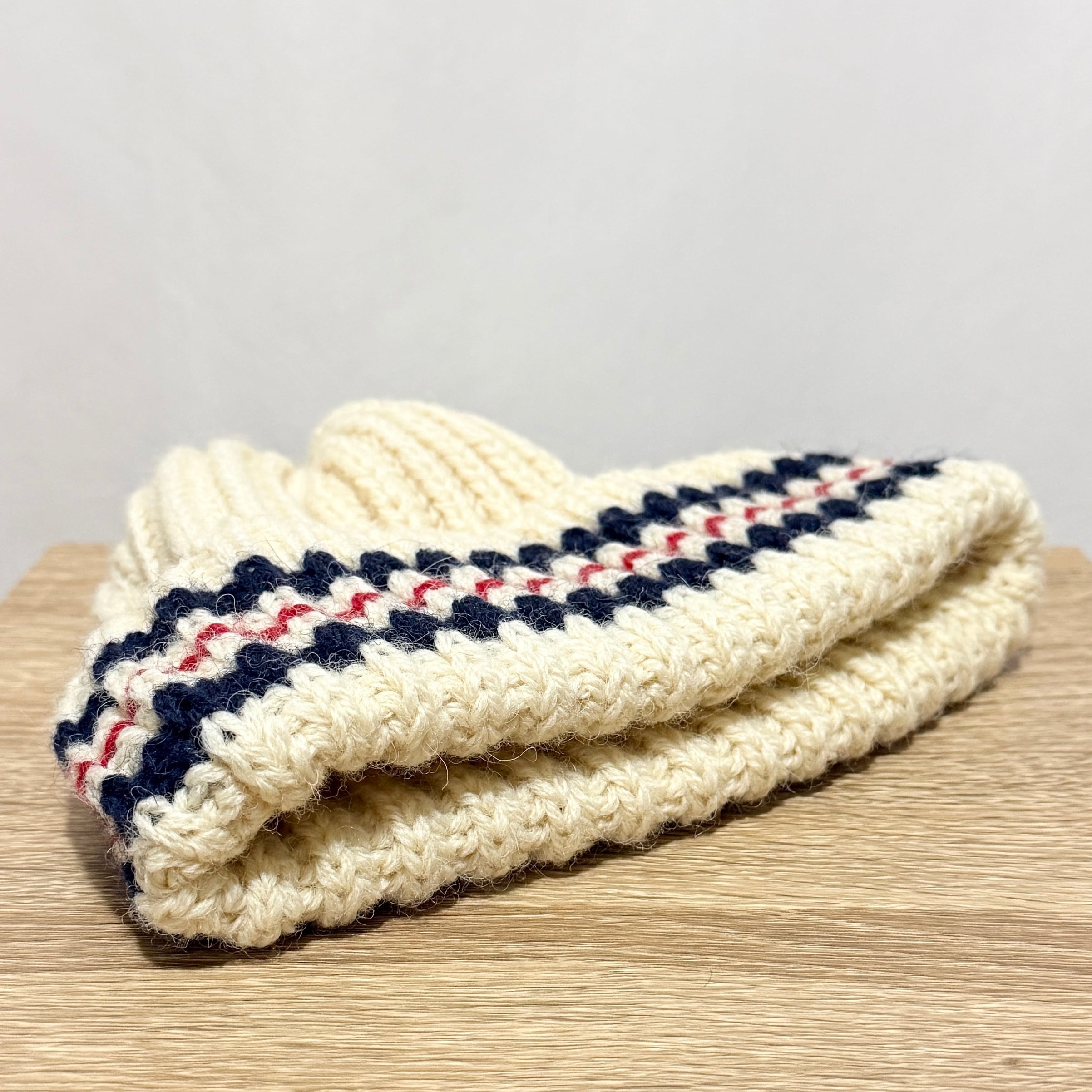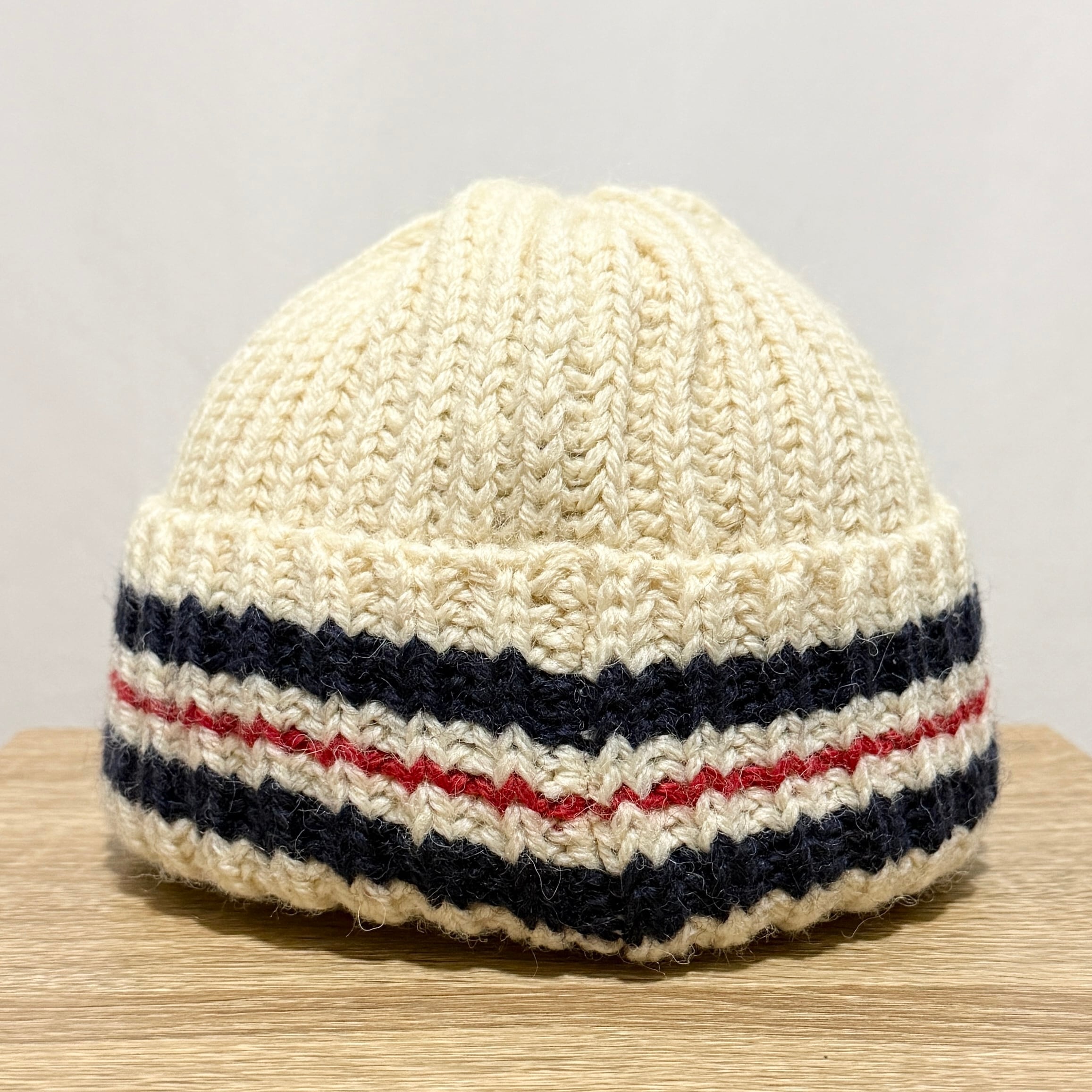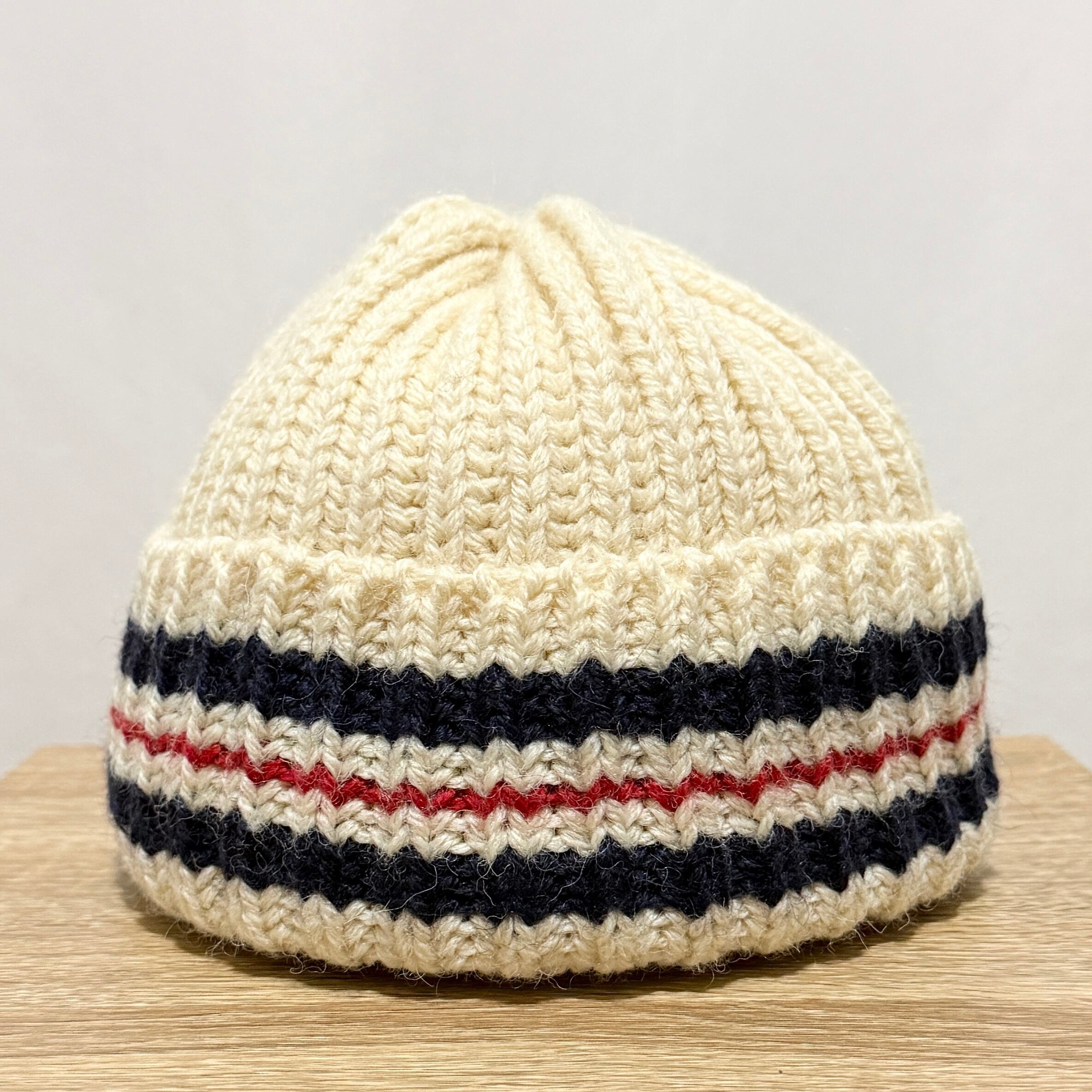 ざっくりなウールでボリューム感が有りつつややショートなワッチスタイル。折り返しのネイビーとレッドはスクール感やプレップ感ありますね◎◎◎