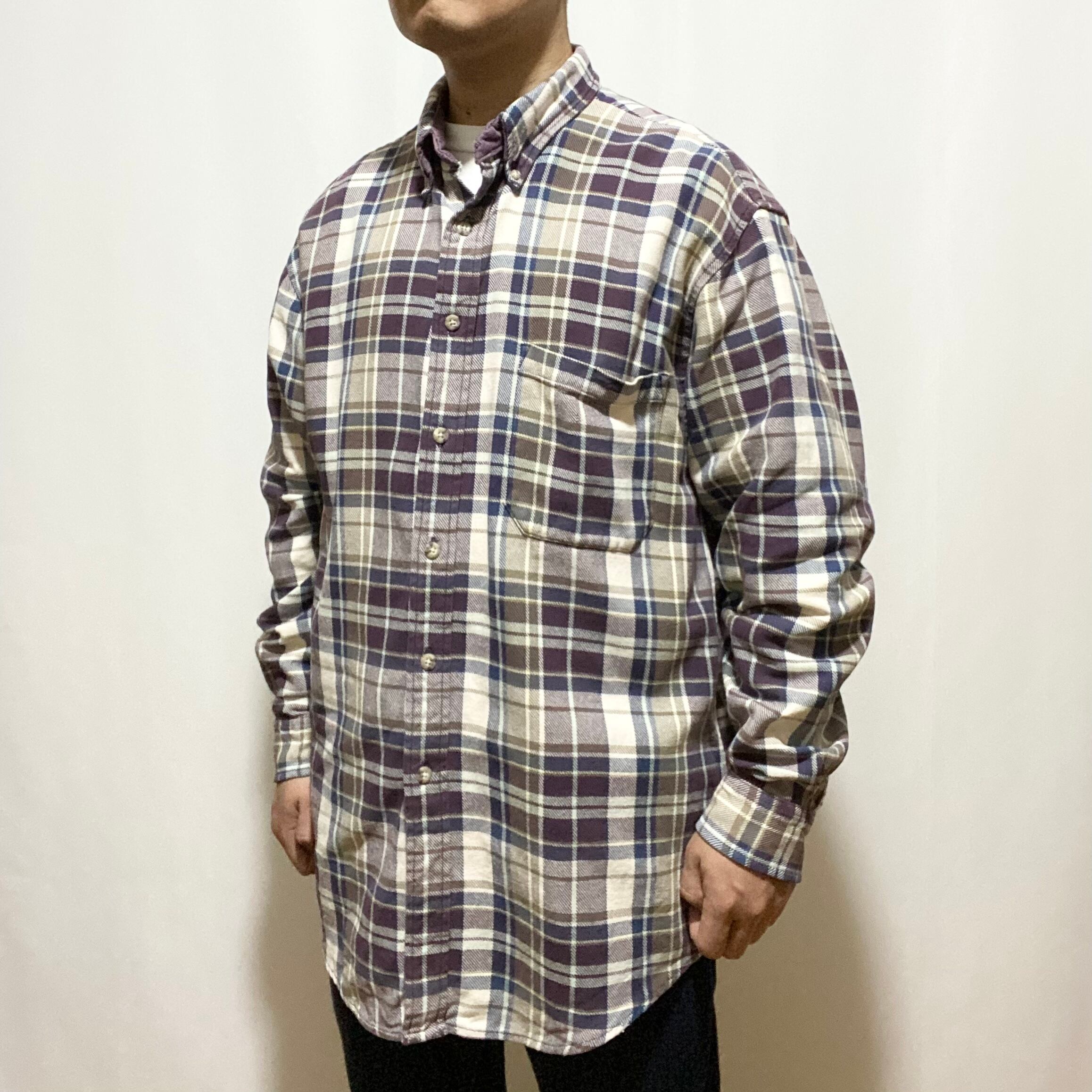 でもってボタンダウンの襟型。ネル生地は起毛感の無い厚手のコットン生地。そして当時物らしいデカいシルエット、と、全くもって意味不明なシャツです 笑