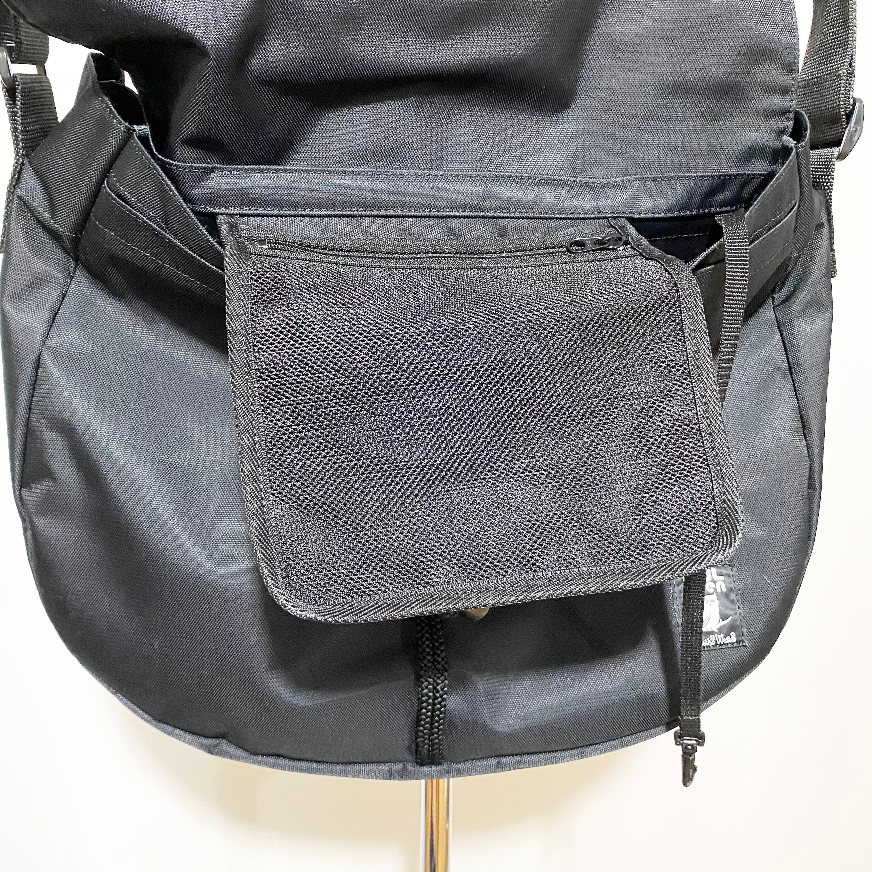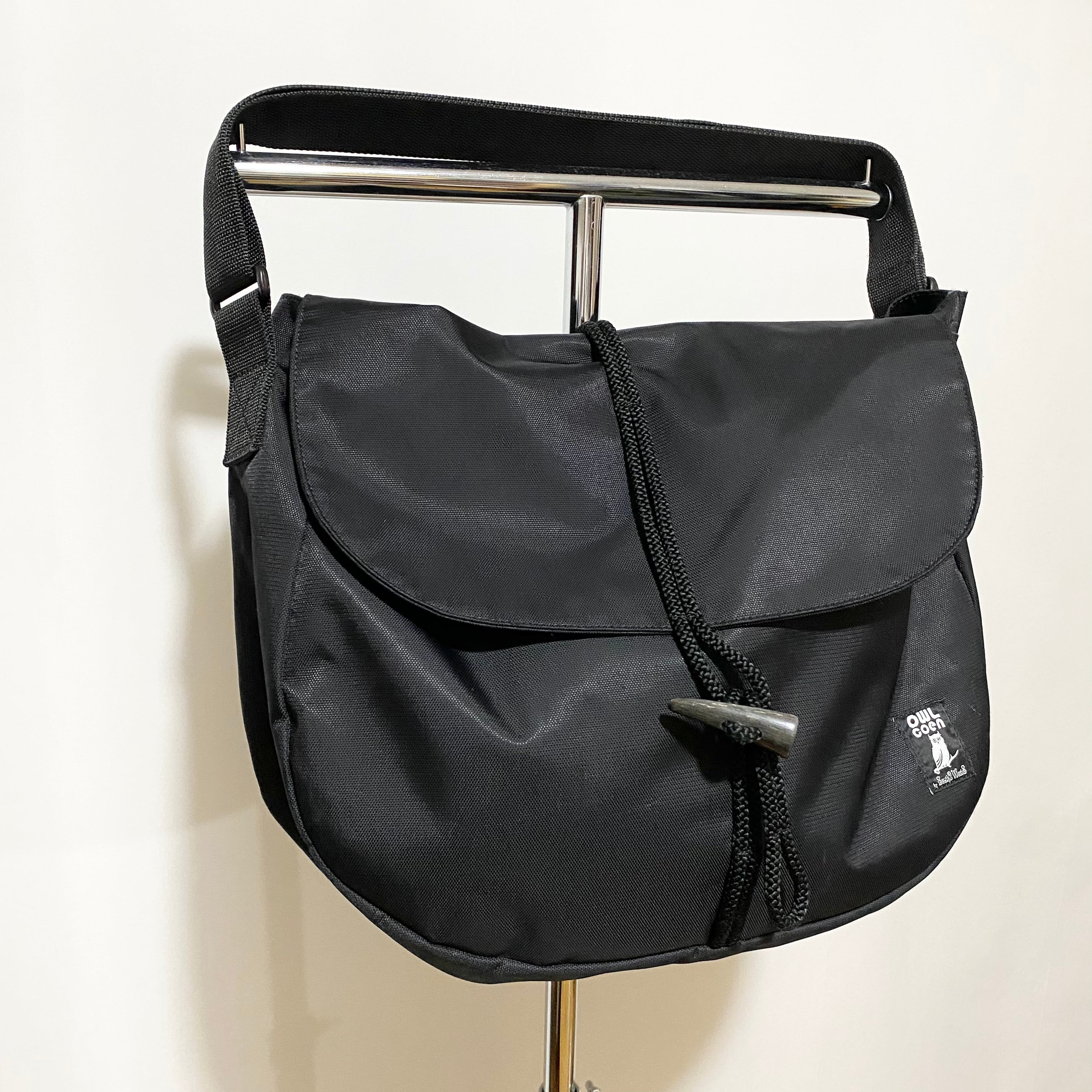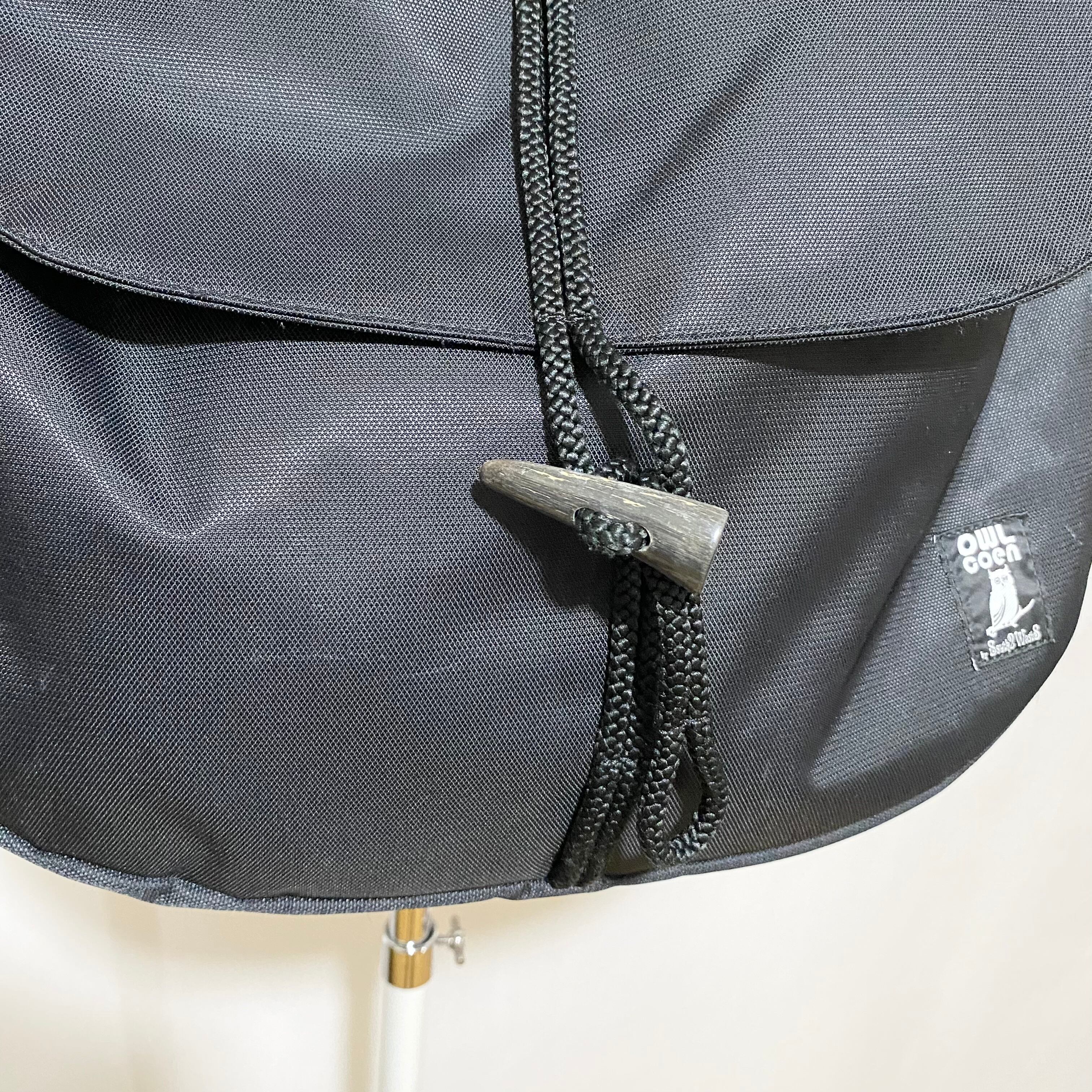 大き目のフラップにロープタイプのストラップを水牛の角で止めるタイプのショルダーバック。ボディやストラップの素材感はチープではありますが、細かい仕切りや雨に強そうなメッセンジャー的構造、デイリー向きの大きさ、間違いないブラックカラーと、とても良く出来たアイテムです◎◎◎