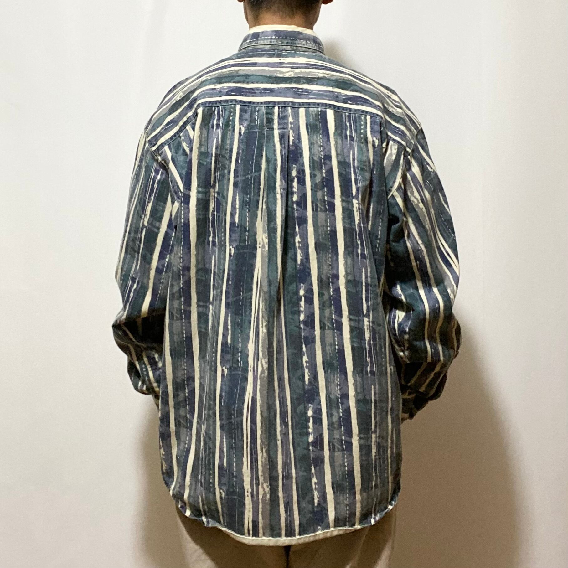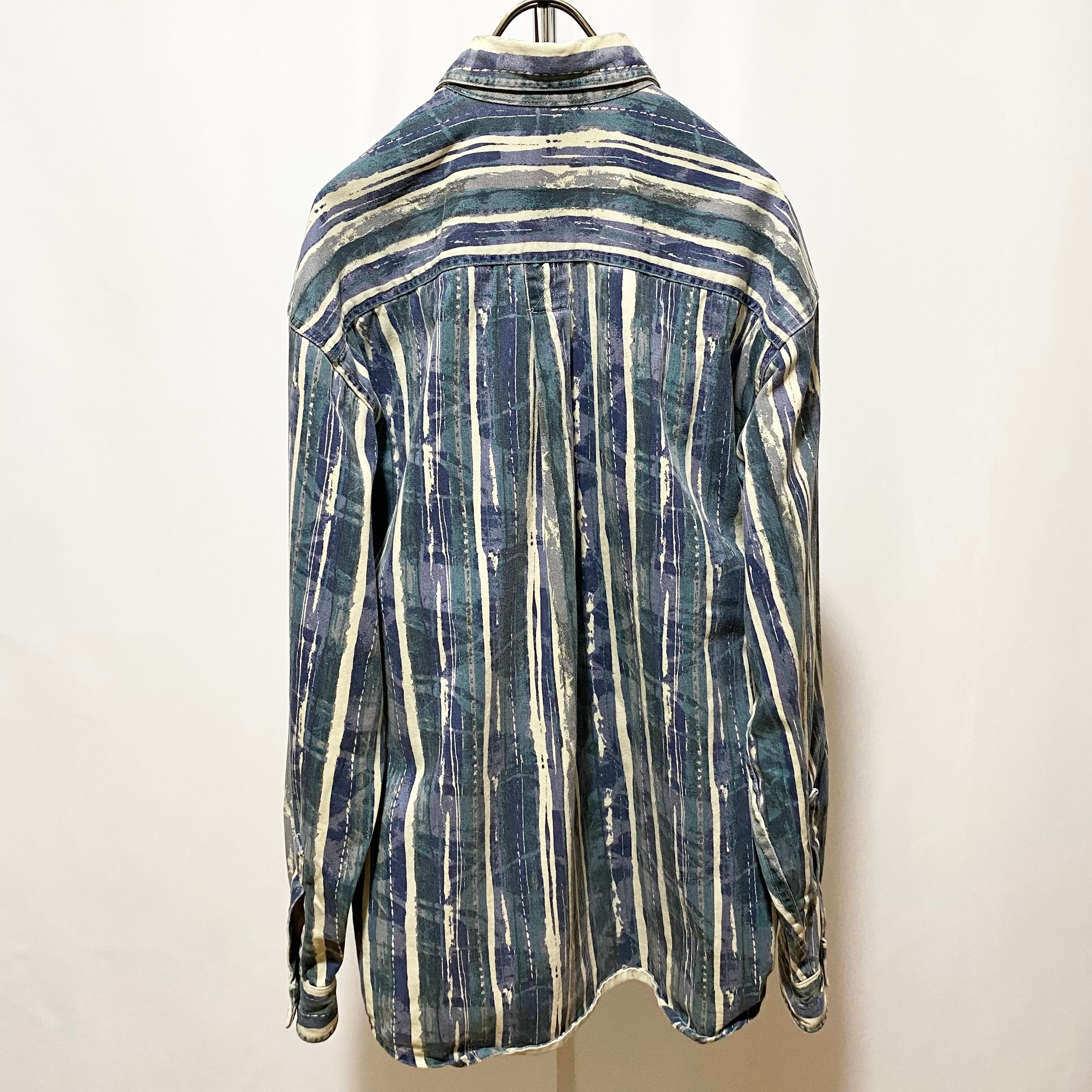 しっかりとした厚みのあるチノクロスの生地にハンドペイントを思わせるストライプが施されたこのシャツ◎◎◎ 80年代後半から90年代前半にかけてのアイテムかと思います。