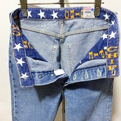 そしてそしてディテールも盛り沢山。バックポケットやベルトループに多めに打たれたリベット、革風パッチは何とコインローファーモチーフ(コインにはユナイテッドステイツオブアメリカの表記!)腰回り内側にはロゴがいっぱいで、ネームはリーバイスサンプリングのロゴで、ボタンフライ◎◎◎