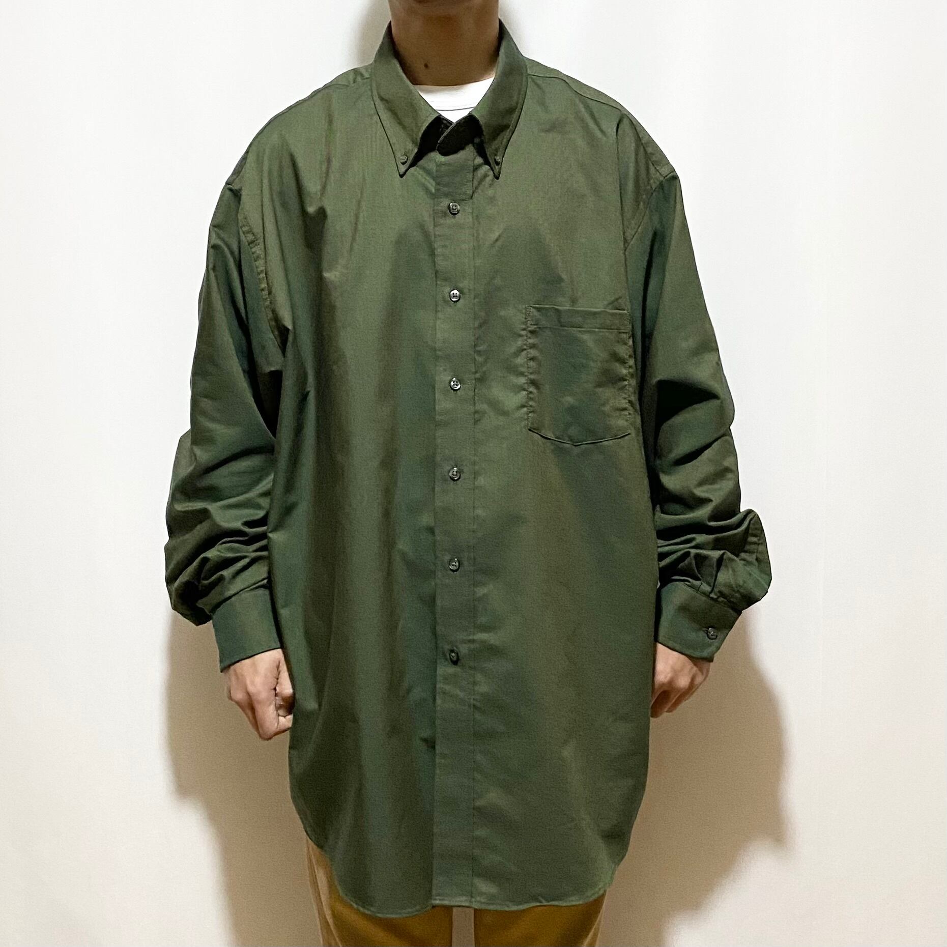 所謂キチンとしたネックサイズ表記のドレスシャツなんですが、ミリタリーを思わせるような深いグリーンで玉虫色のオックスフォード生地という、見た事の無い生地使いが最高です◎◎◎ 濃い目の色のシャツってともすればモード過ぎたり、サイズや形によってはホストみたいな見た目に陥りやすいんですが、しっかりとトラディショナルな枠に収めているのが◎◎◎ 着てみると袖は長く感じるもののコモリとかそっち系の雰囲気も感じます。