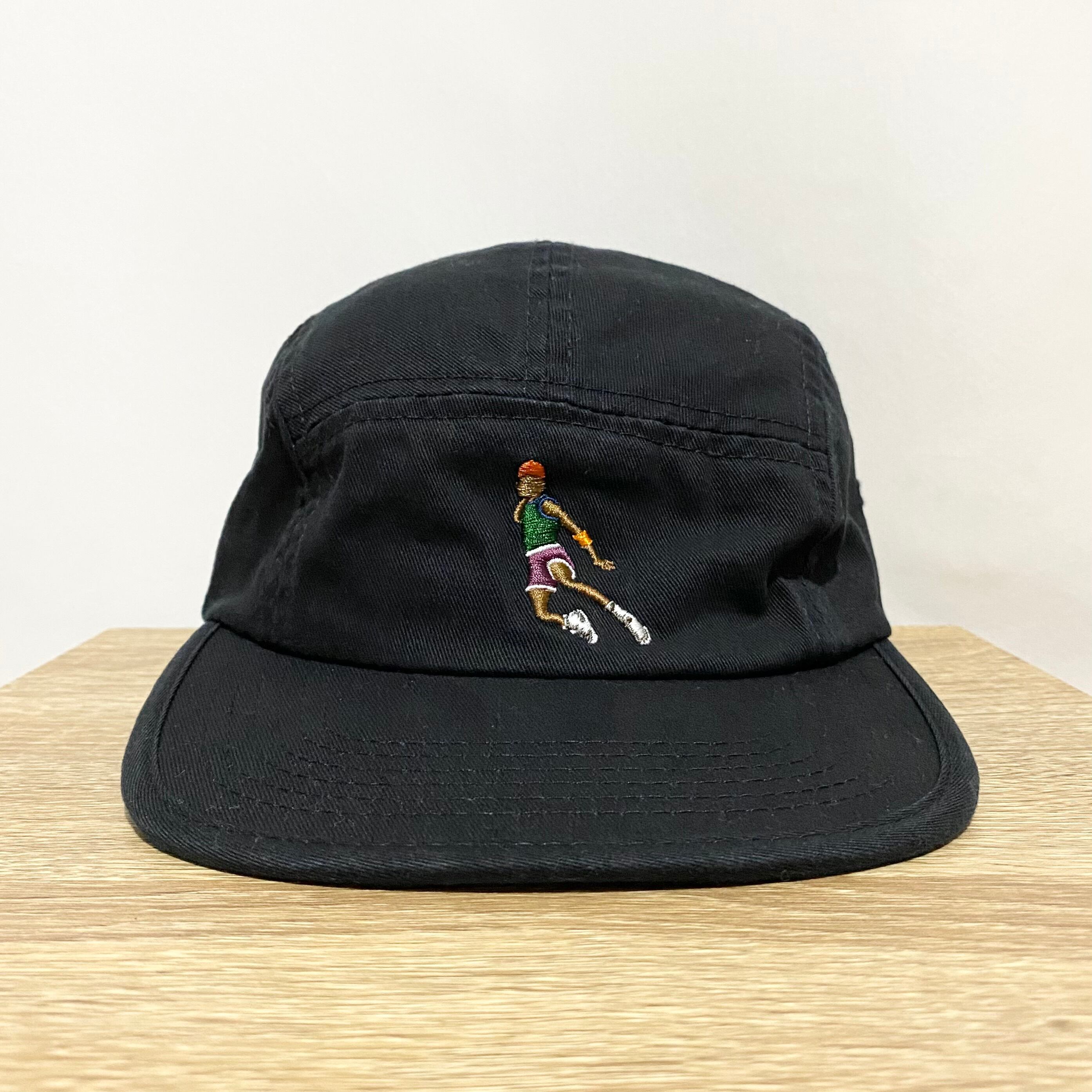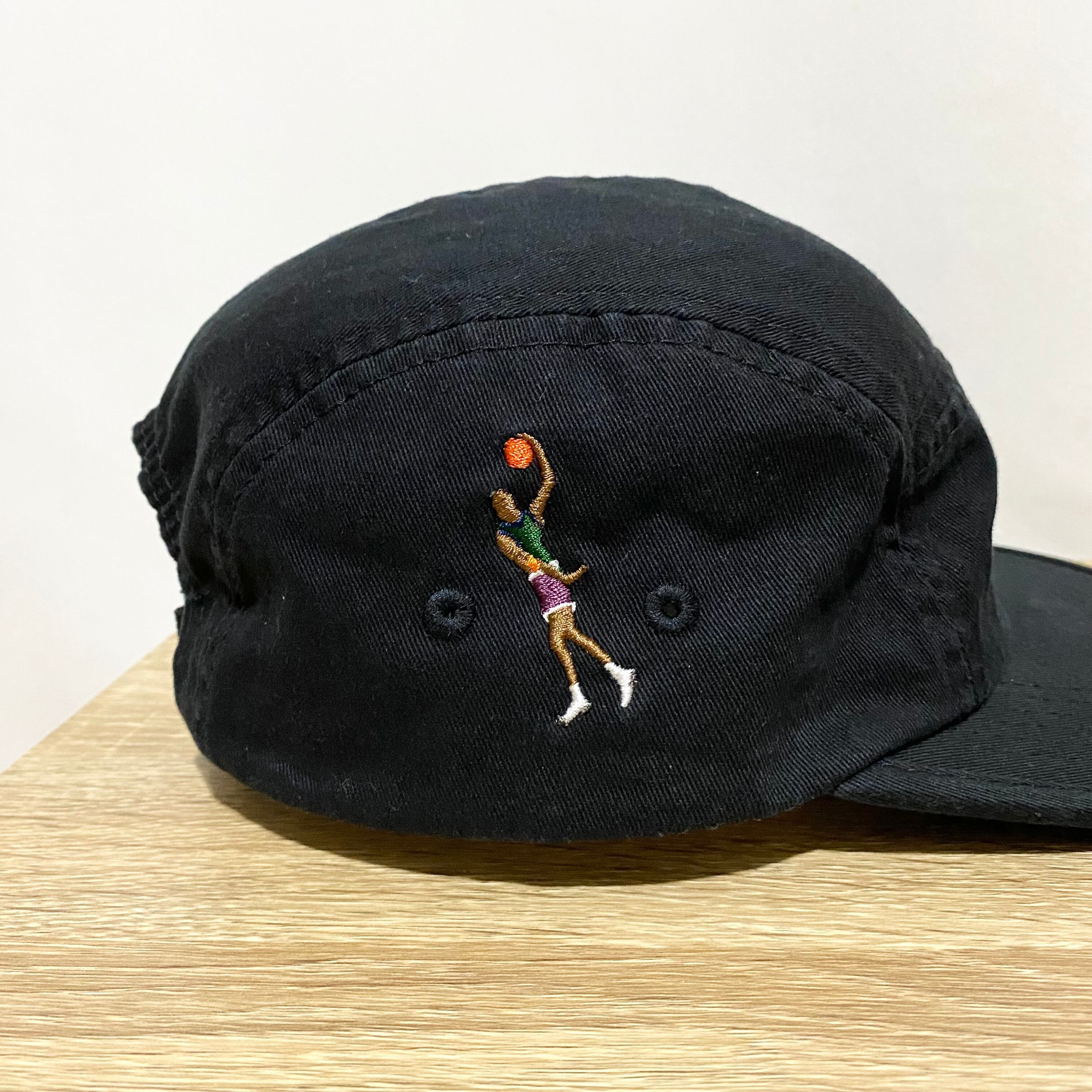 ジェットキャップのスタイルにバスケットプレイヤーの刺繍を3面に、バックにファイブストライクスの刺繍をさりげなく。