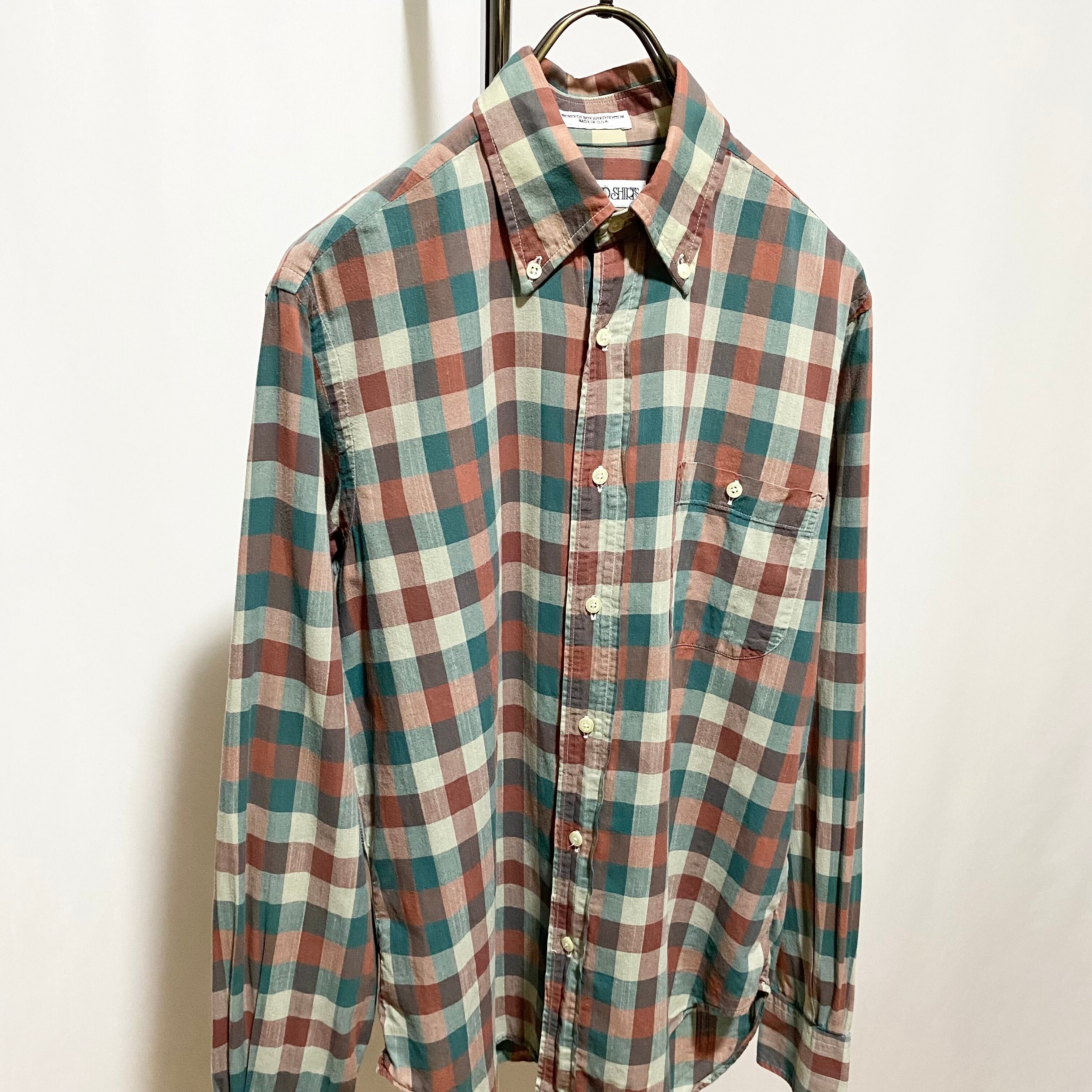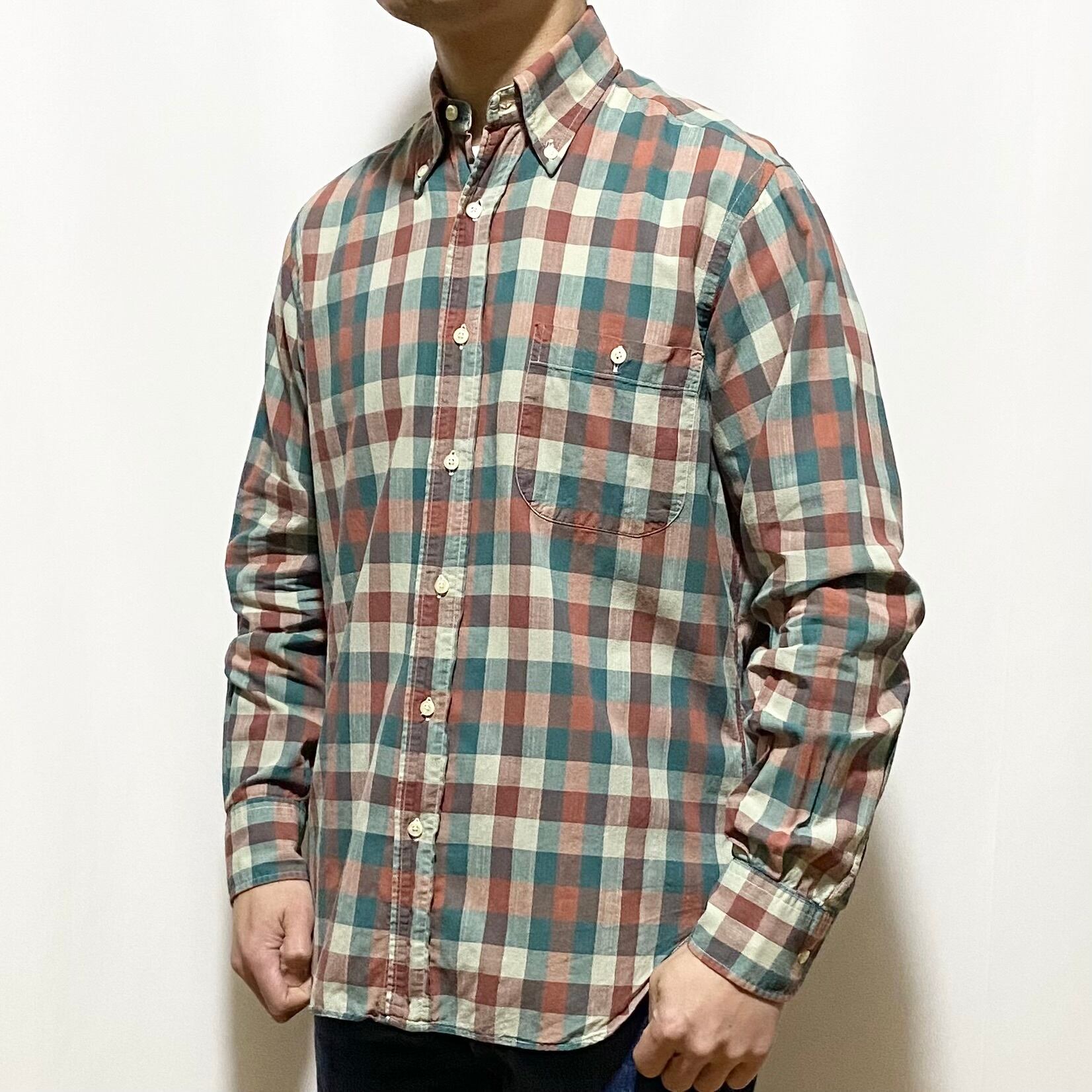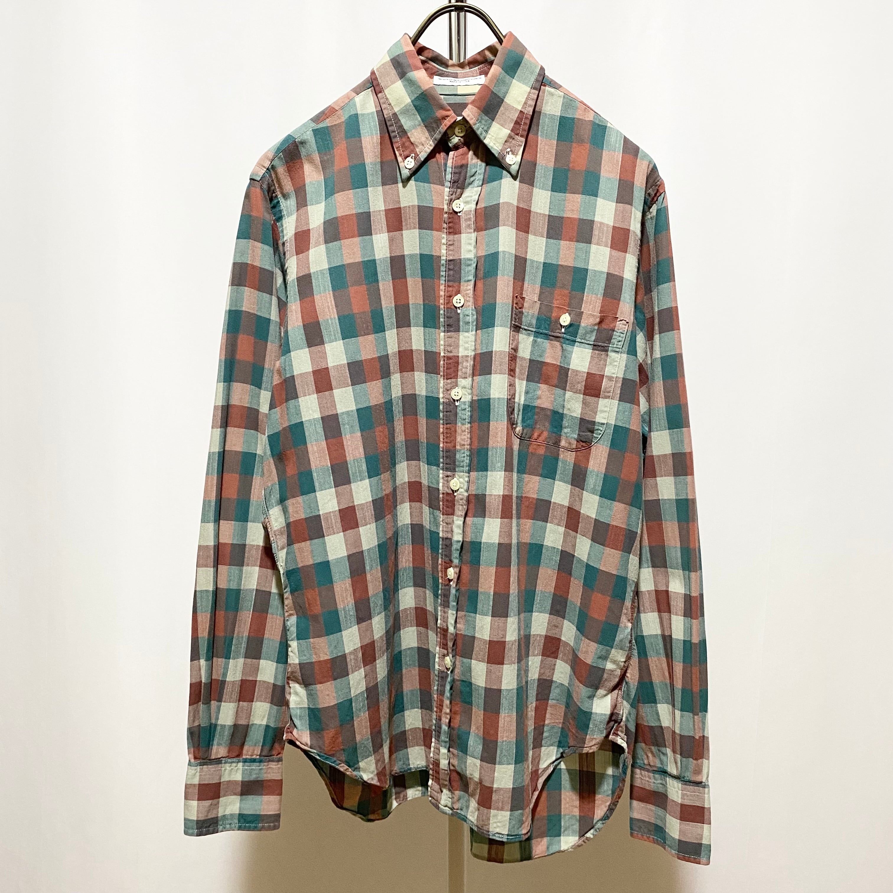 こちらのボタンダウンは薄手生地で少しくすんだヴィンテージのシャツようなカラーリングが目を引くチェックシャツ。胸ポケがフラップ無しなのにボタン止めになってる辺りも珍しくてイイ感じ◎◎◎