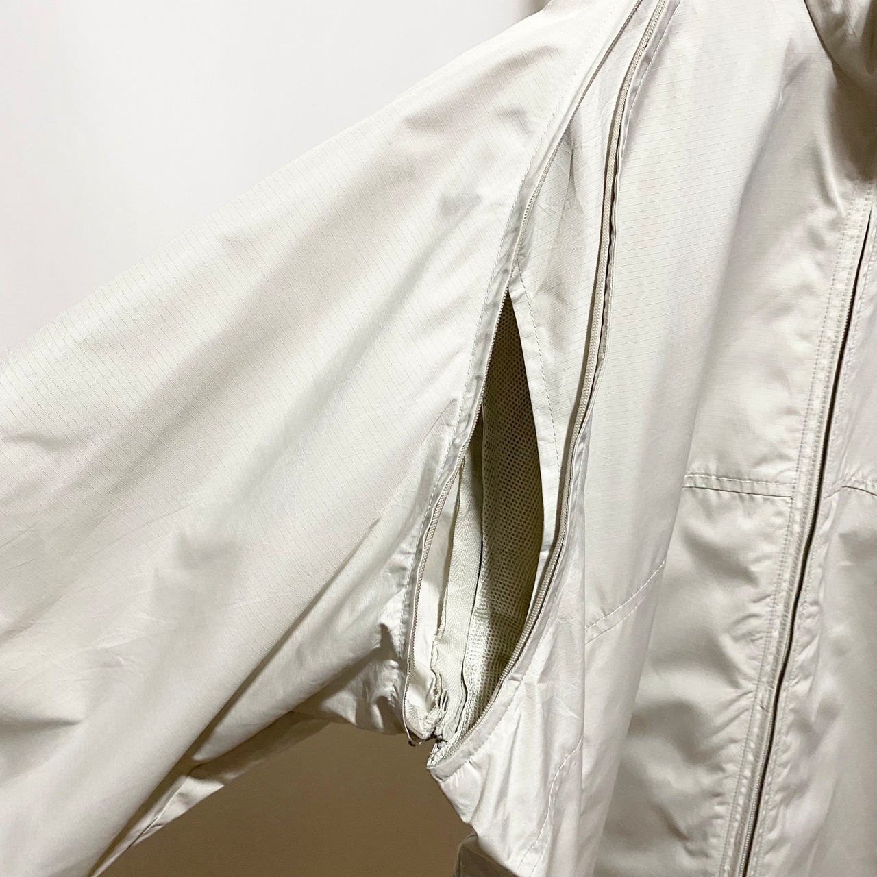 ポリエステルのシャカシャカ系リップストップ生地にメッシュの裏地。背中には切り替えとポケット。袖口にはさりげない刺繍とその他の仕様もバッチリ◎◎◎