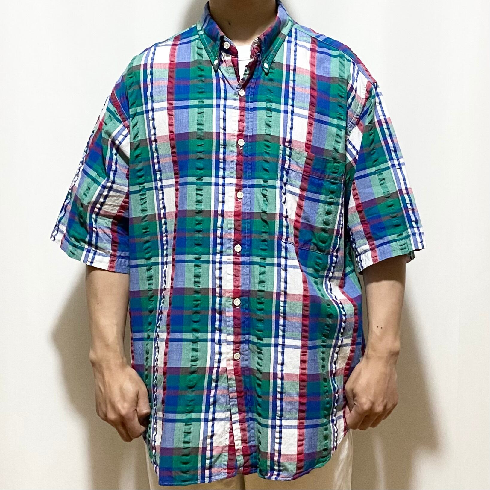 Lands' End Seersucker CHK B.D Shirt S/S Green Blue Red White Made in USA 90s