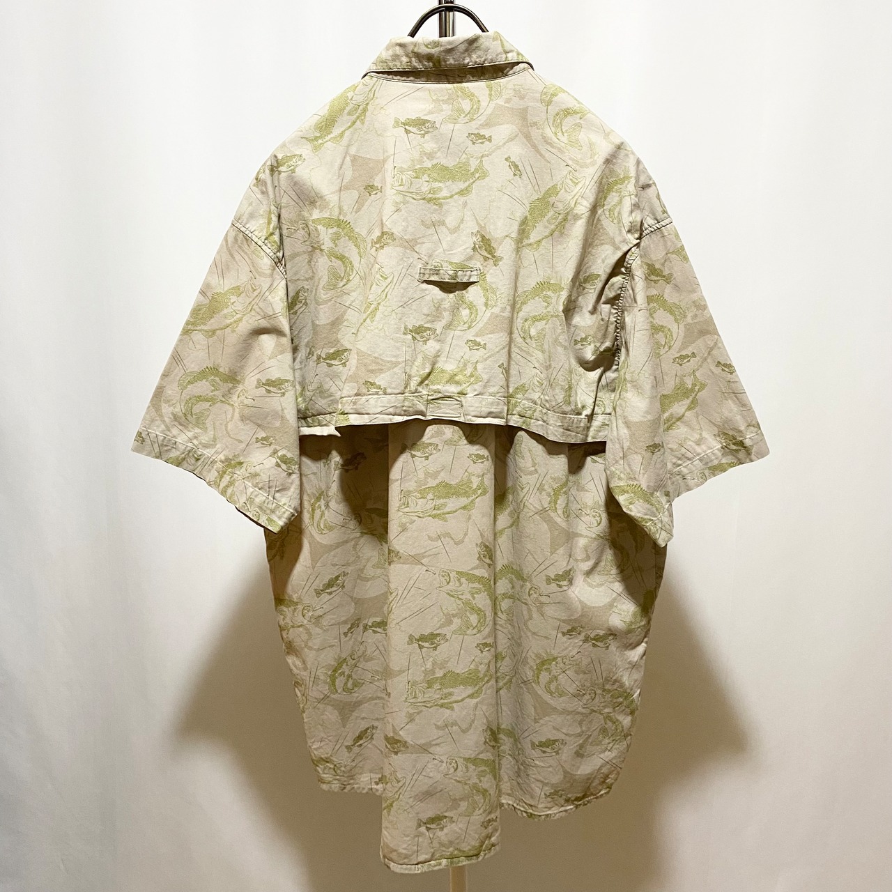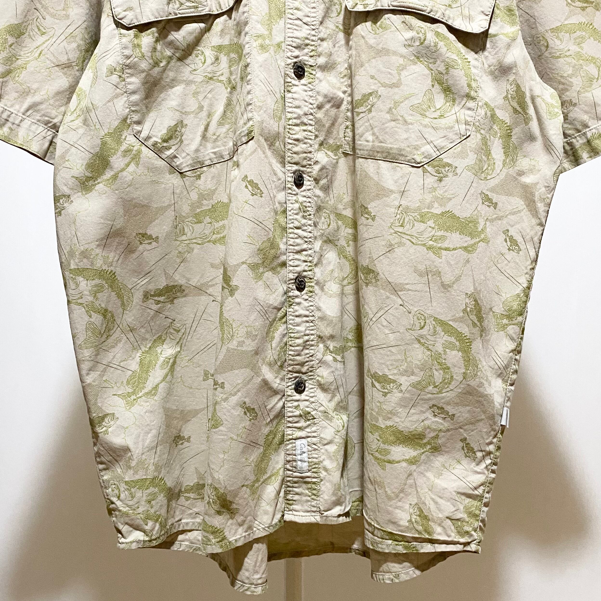 全面に落ち着いた色味でルアーに食いつく魚がプリントされたこのシャツ◎◎◎