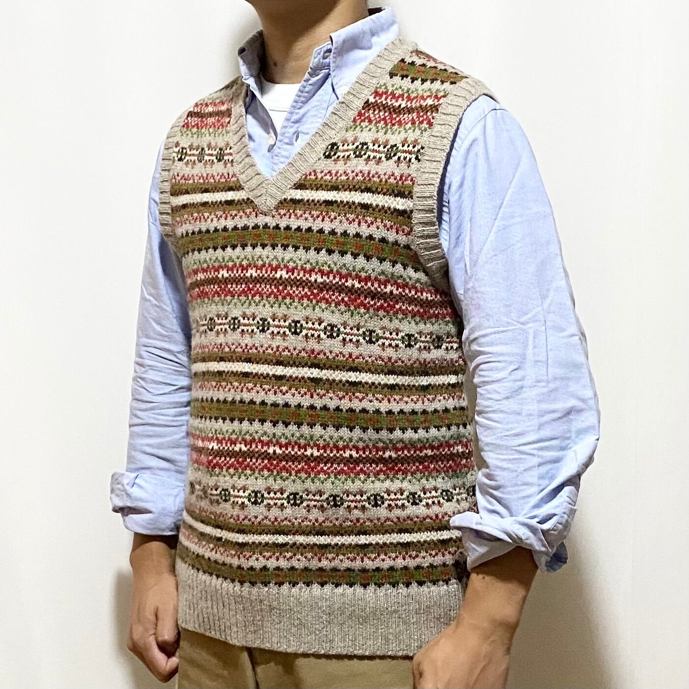 今回は実にトラッドなフェアアイル柄のニットベスト。Vネックでタイドアップは勿論、ベストなのでテーラード等のスタイリングに使えます(袖があるとアームがもたつくので)