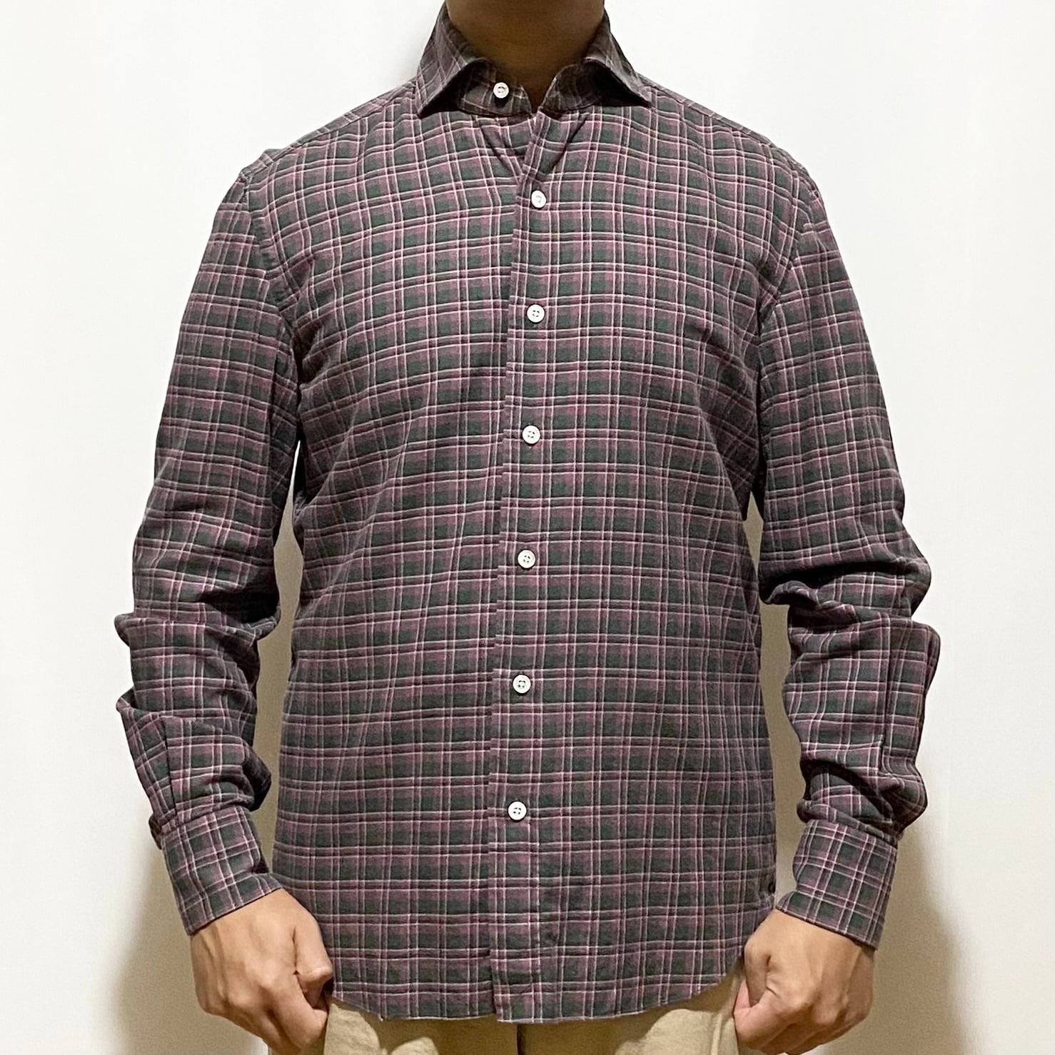 軽めで起毛感も少なく、秋冬の紡毛生地だけでなくサージな質感にも馴染むカジュアルなドレスシャツです◎◎◎