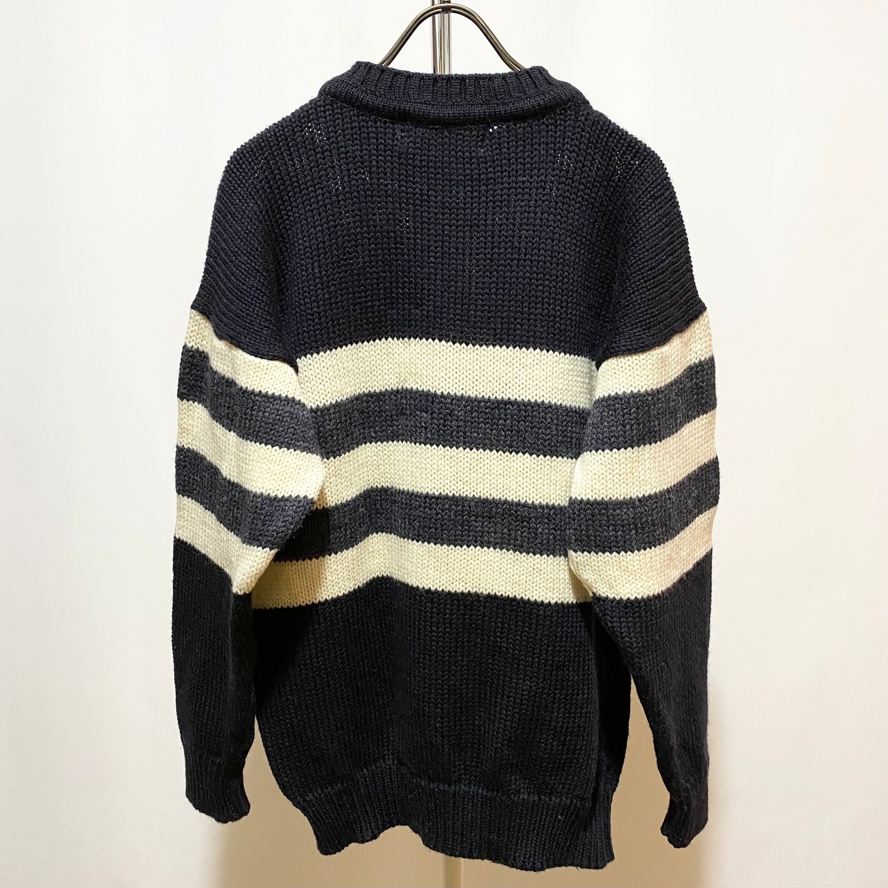 黒に近いぐらいの濃紺にグレイッシュなネイビーとホワイトのボーダーがアクセントで入ったこのニット。ハンドフレームニットで上質なウール、そしてモックネックでクラシックなフィッシャーマンスタイル。モダンだけど、どこか懐かしい印象の最高のニットです◎◎◎
