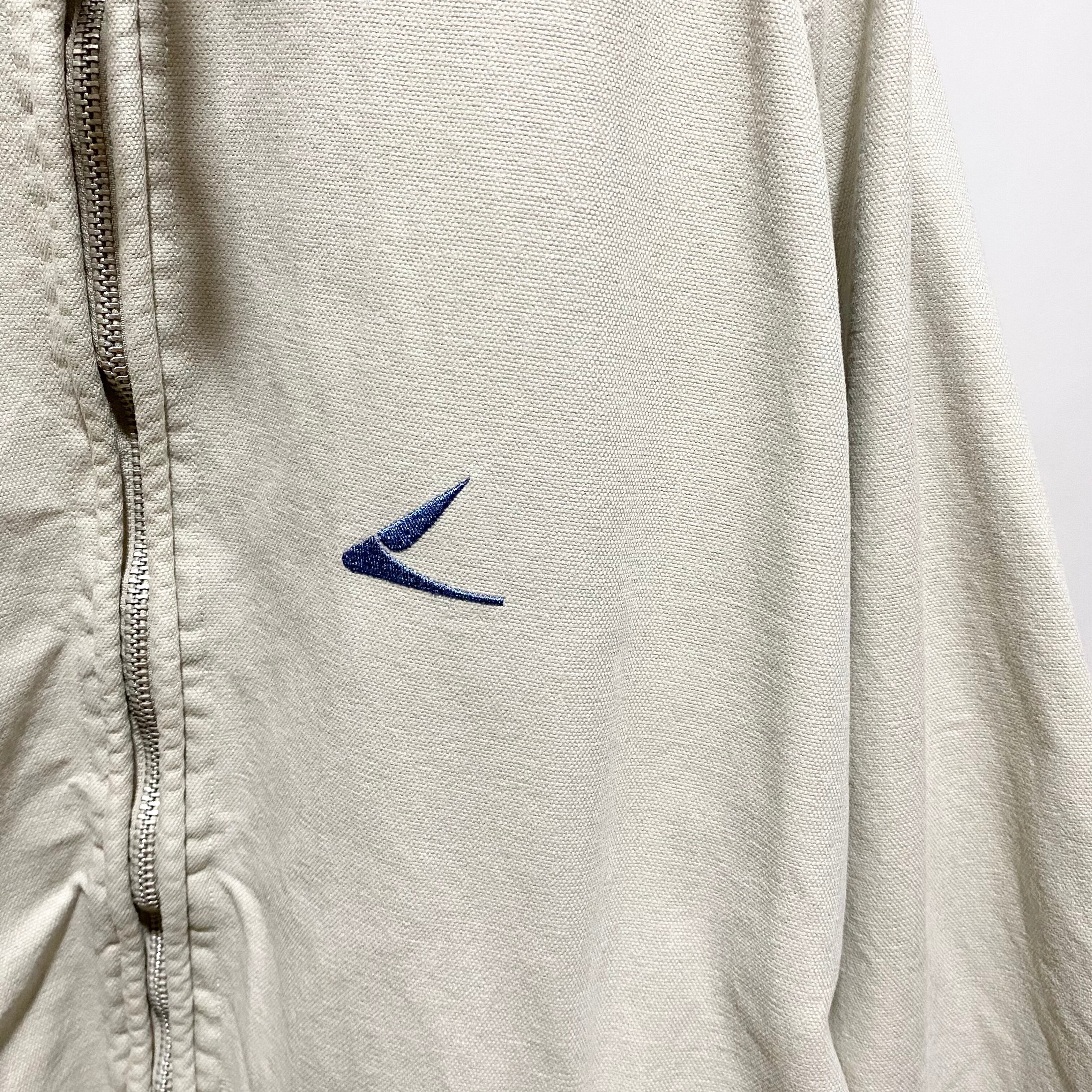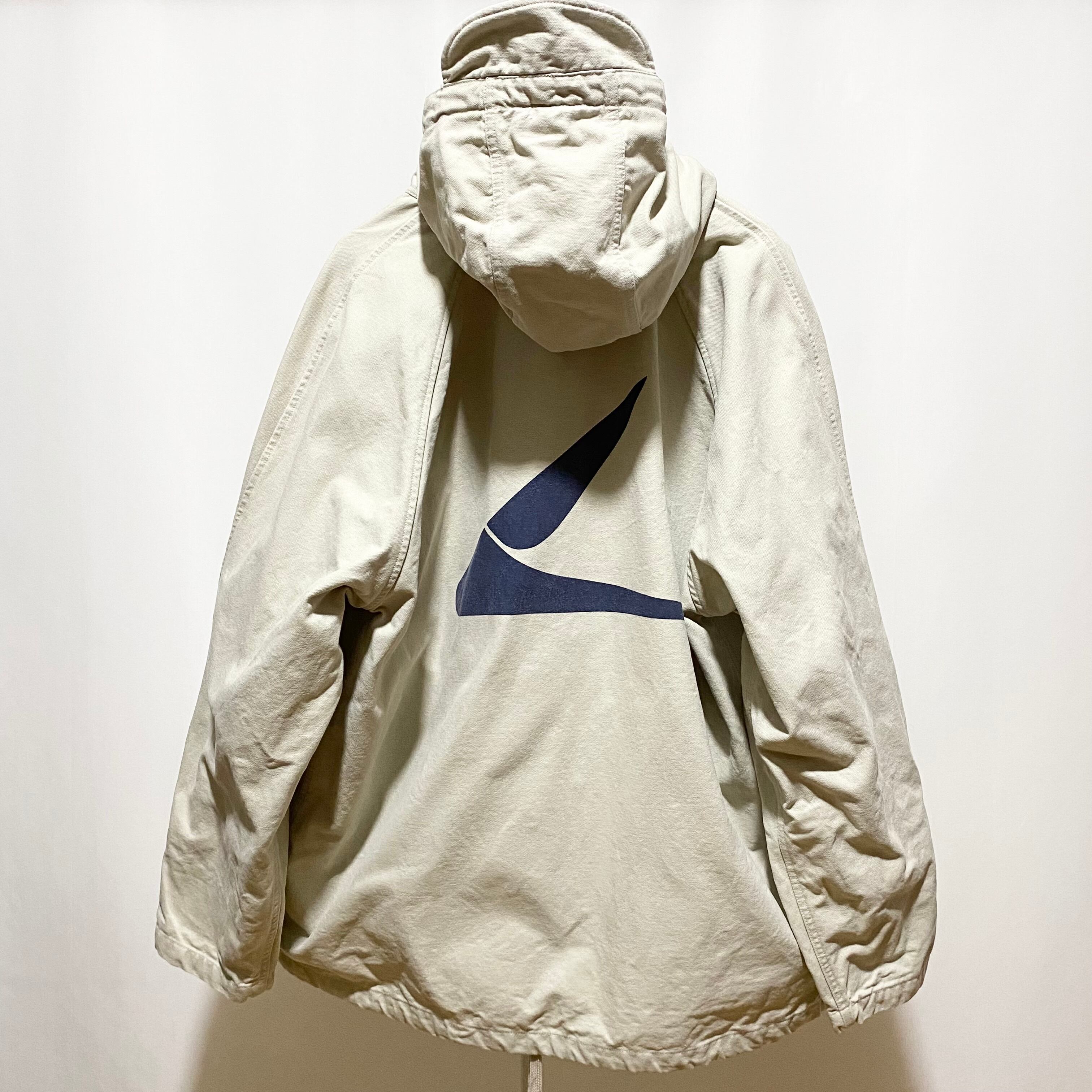 胸のワンポイントは刺繍、背中には大きなバックプリント、立体的なフードに肉厚なダック地。裾はフラットでサイズもリラックス感あります。