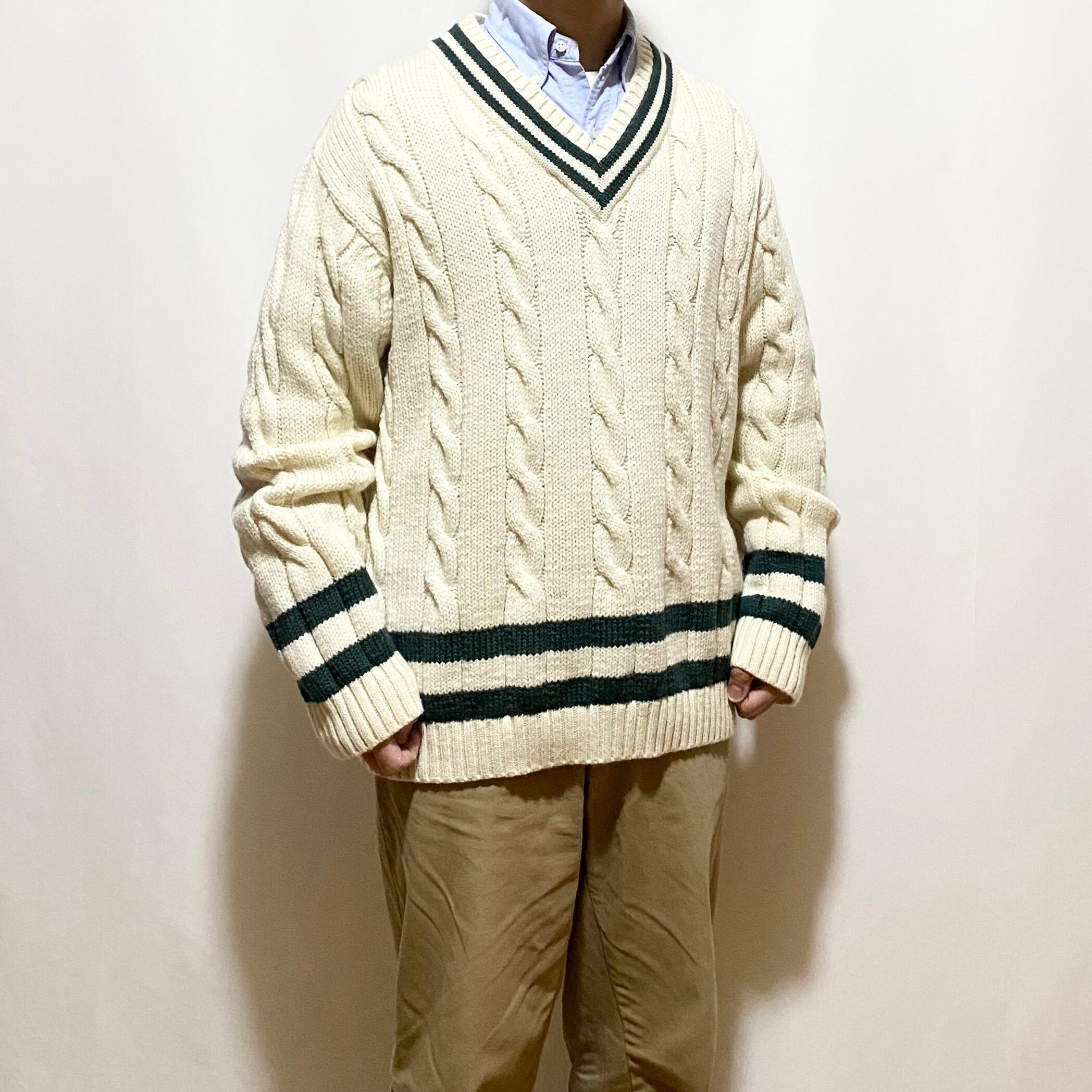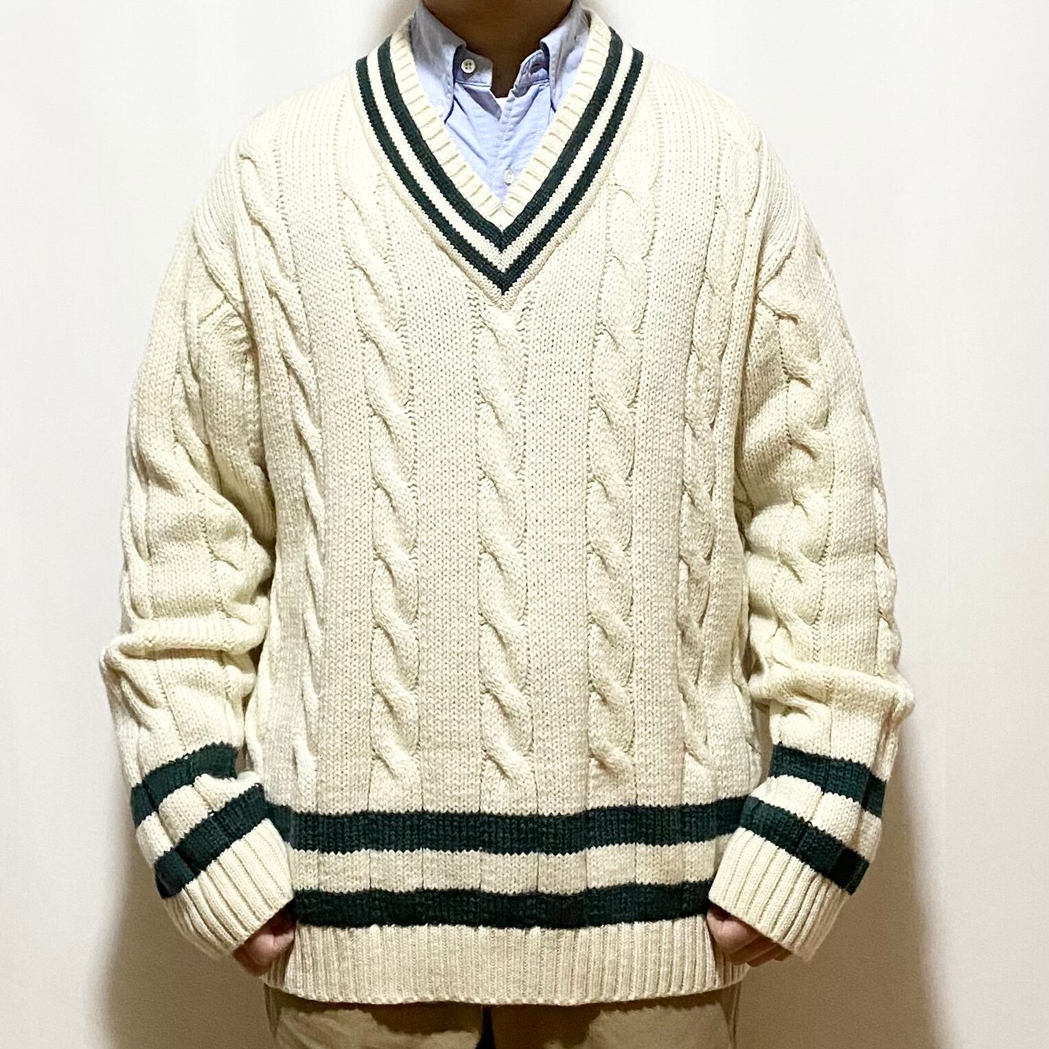 しっかりしたケーブル編みでざっくり大きいシルエット。テーラードの下に着る感じでは無くこれ自体が主役の存在感溢れる1着◎◎◎